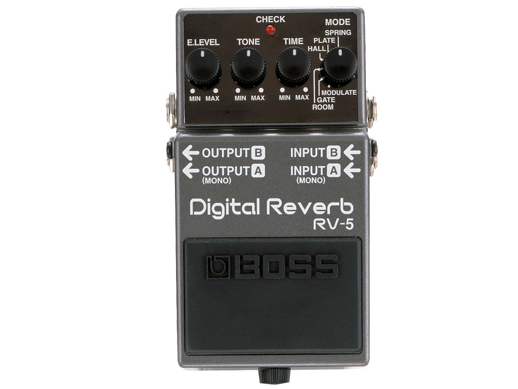L'RV-5 è un nuovo pedale riverbero della Boss che può essere considerato un versione avanzata del precedente RV-3. Così come nella consuetudine delle più recenti realizzazioni Boss, l'RV-5 è ottimale per contesti in cui è necessario un segnale realmente stereofonico ed a questo proposito è dotato di input ed output stereofonici che rendono adatto questo effetto al suo utilizzo anche con altri prodotti come ad esempio tastiere e sintetizzatori. L'RV-5 offre 6 modalità di riverbero tra le quali alcune di nuova realizzazione come l'emulazione del riverbero a molla. Un salto in avanti quindi a livello di qualità ad un prezzo ancor più conveniente.
