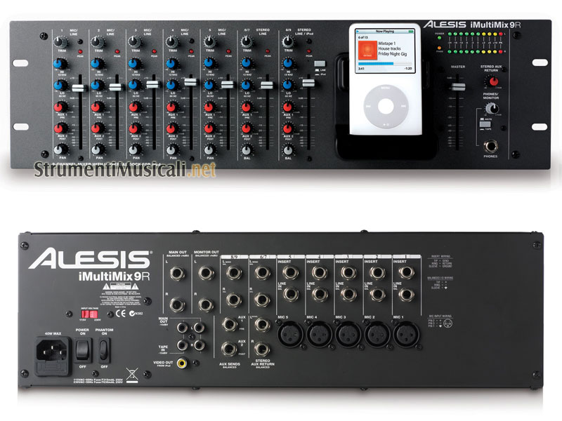 Alesis presenta l'iMultiMix 9R mixer con dock universale per Ipod. Questo solido e compatto mixer montato su rack con player per ipod integrato include 5 entrate mic/linea con inserto permettendo così un semplice processamento esterno dei canali in entrata o dell'audio riprodotto dall'ipod. L' iMultiMix 9R include anche un equalizzatore a 2 bande per canale,entrate mic/linea e riproduzione per Ipod in un singolo ed intuitivo pacchetto. L'iMultimix 9R può riprodurre musica dall'ipod e mixare in contemporanea la propria performance live. Questo rende l'iMultimix 9R la soluzione ideale per l'utilizzo di brani dall'ipod durante performance di gruppi o di cantanti utilizzando un solo e compatto prodotto.