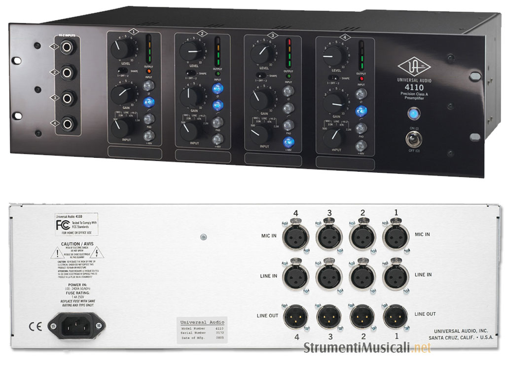 The 4110 provides four channels of premium Class A, all discrete amplification and is the first analog product from Universal Audio to break from our vintage roots and offer a world-class tool of “ultra-fidelity” and still provide musical and warm euphonics. Every channel of the 4110 features custom input stage transformers, dedicated Gain and Level controls, input and output metering, dual input impedance selection, Hi-Z inputs, and a 3-way “Shape” switch offering a variable signal-path for maximum sonic versatility.