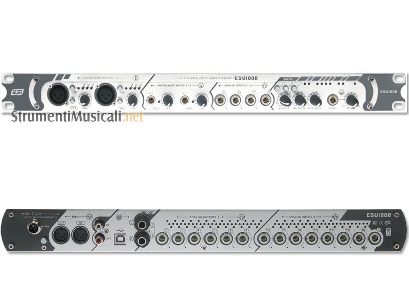 La ESU 1808 è una scheda USB 2.0 Hi Speed con 18 ingressi (!) e 8 uscite e convertitori a 24bit/96kHz con due preamplificatori microfonici, due ingressi ad alta impedenza Hi-Z, SPDIF I/O e MIDI I/O. Anche in questo caso si tratta di una prima assoluta per dotazione di ingressi e uscite in un'interfaccia USB. Supporto per Windows XP e Mac OSX con driver ASIO 2.0, GSIF 2.0, WDM e CoreAudio.
