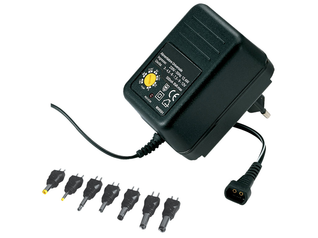 Alimentatore universale compatibile con qualsiasi apparecchiatura necessiti di tensione fino a 12V con un'assorbimento massimo di 500 mA. E' dotato di sistema multiplug che permette di inserire solo l'adattatore necessario.