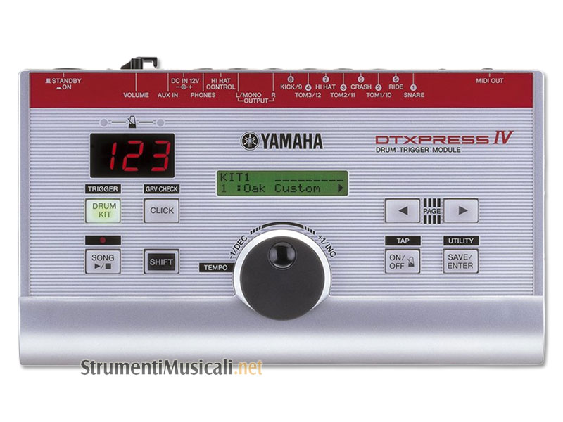 DTXPRESS IV vanta un'ottima selezione di compionamenti per batteria acustica Yamaha, tra cui quelli della serie Yamaha Oak, dal suono molto potente e solido. L'unità è compatibile con pad 3Zone e funzioni di controller, per una maggiore espressività e facilità di esecuzione. Grazie all'ampio display LED è possibile visualizzare in maniera chiara e immediata tutte le informazioni, come tempo e modalità.