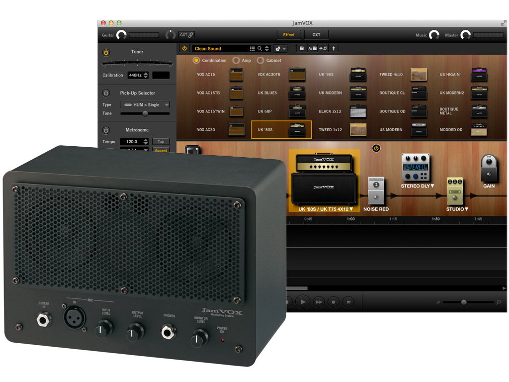 JamVox è un rivoluzionario sistema integrato costituito da una scheda audio USB con monitor integrato ed un software dedicato per chitarra in grado di estrarre le tracce di chitarre da ogni tipo di brano musicale. Cosa rende unico il JamVox è la sua rivoluzionaria funzione GXT (Guitar XTracktion), una tecnologia sviluppata dalla collaborazione tra VOX e KORG che consente la rimozione della traccia di chitarra tramite un sistema intgrato di analisi delle frequenze e filtri. Grazie a questa funzione sarete in grado di rimuovere la traccia di chitarra, usarla per fini didattici, cambiare il tempo o il pitch, oppure suonare la parte di chitarra sulla base e persino registrarsi. Grazie al software integrato, inoltre, c'è la possibilità di ricreare i suoni dei propri guitar hero e persino migliorarli grazie alla possibilità di utilizzo di ben 19 modelli di ampli e 54 tipi di effetti, oltre alla dotazione di 100 preset già configurati. Inoltre, in dotazione con il JamVox, 2 CD con 28 tracce rock (classici come Pink Floyd, Nirvana, Aerosmith ecc.) con le quali iniziare da subito a suonare. Altra opportunità offerta dal JamVox è quella di scambiare i propri modelli sonori realizzati con il software in dotazione attraverso il sito dedicato JamVOX-online.com.
