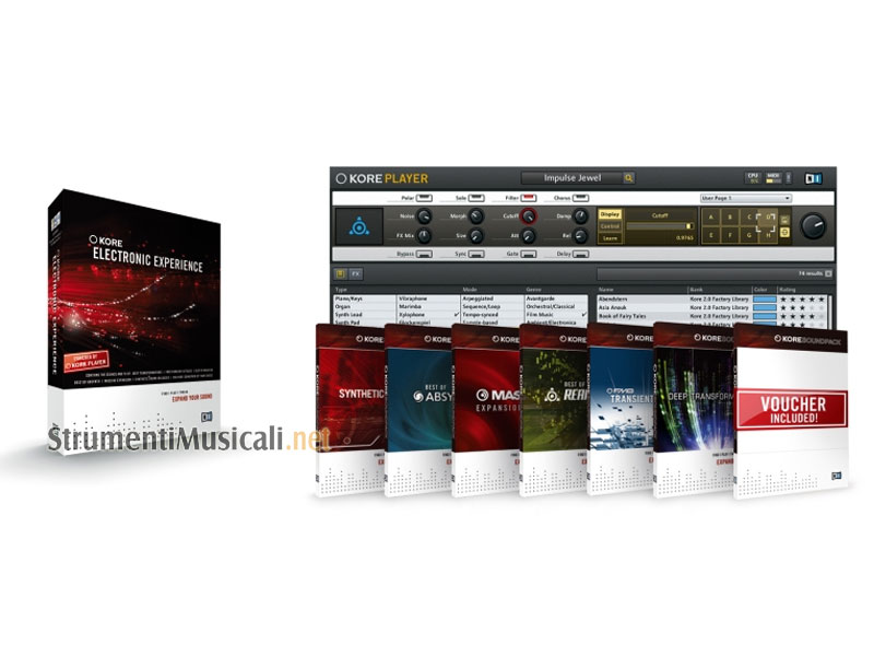I migliori suoni elettronici della Native Instruments sono ora disponibili per tutti. Kore ELECTRONIC EXPERIENCE è un bundle che offre una grande libreria composta da sette Kore SOUNDPACKS e include il software Kore player - lo strumento, ed il multieffetto ideale per l'uso con qualsiasi sequencer. Il pacchetto è anche una straordinaria libreria di espansione per Kore 2.