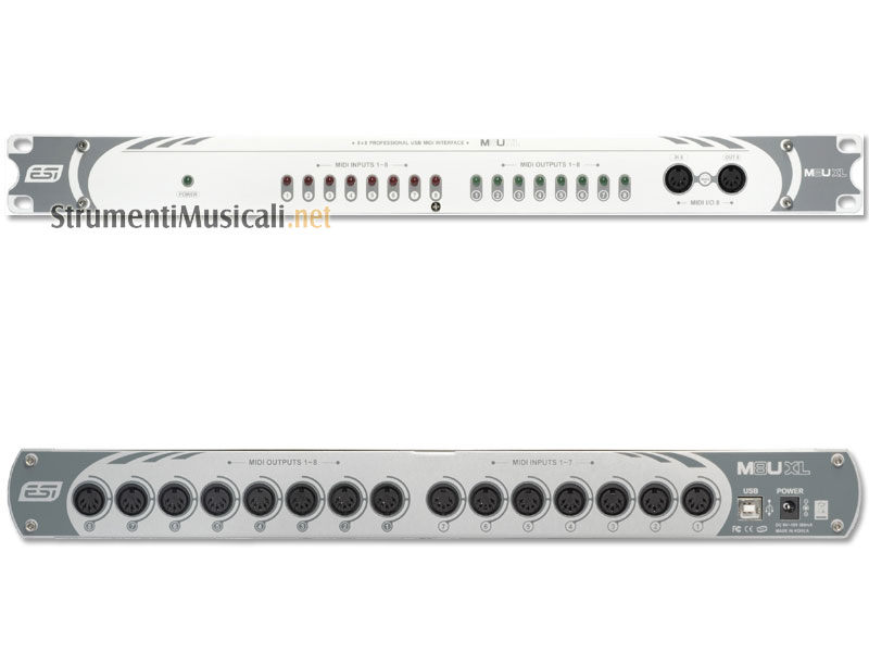 M8U XL offers maximum MIDI connectivity with 8 independent MIDI inputs and 8 independent MIDI outputs, providing 128 MIDI channels - all via a single USB 2.0 (or USB 1.1) connection to your PC or Mac. The 1U sized replacement for M8U provides 1 MIDI input and 1 MIDI output on the front for easy access, next to status LEDs for all MIDI I/O ports. All the the other MIDI I/O connectors are on the backside of the unit. Like with all current MIDI interfaces from ESI, M8U XL shows the real meaning of Plug-n-Play as the installation could not be more simple: under Windows XP, Windows Vista and Mac OS X, no driver installation is required.You simply plug-in the unit and the device with all MIDI I/O port will be detected automatically and can be used imediatly. The unit is fully class compliant, making it compatible with various other operating systems like various Linux distributions. M8U XL was announced in early 2008 and will be available in early September 2008.