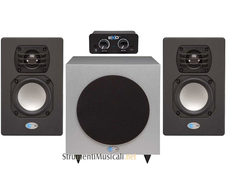 Blue Sky's EXO stereo monitoring system combines true, full range monitoring with the convenience of a desktop remote control hub - all at a great low price. Like the larger Blue Sky systems used in professional recording studios and movie sound stages, the bass is handled by a separately enclosed woofer, and the mid/high frequencies by the satellite speakers, leaving both uncompromised to do their jobs properly.The result is accurate, full range sound with solid, controlled bass, clear mid/highs, and exceptional stereo imaging. The overall volume of the system and the level of the bass can be controlled easily and conveniently from the desktop remote hub, which also features an iPod input and headphone jack. Professional connectors on the rear of hub accept simultaneous inputs from a professional mixer/DAW and a soundcard/CD player, making EXO perfect for applications as diverse as desktop music recording, audio production, multimedia creation, video editing and gaming - or simply for listening to music or watching movies with stunning, full range sound.