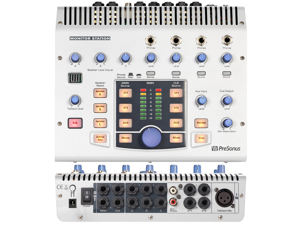 La Monitor Station è l'ultima novità nel campo dei sistemi per il monitoring per studi di registrazione. Nata dal progetto della famosa Central Station, la Monitor Station prevede funzioni di talkback, selezione di più monitor d'ascolto, scelta del segnale sorgente in ingresso e quattro amplificatori per cuffie, il tutto per soddisfare qualsiasi vostra esigenza di controllo del vostro ambiente di registrazione. La Monitor Station vi permette di collegare fino a tre sorgenti audio (TRS1, TRS2, Aux/Phono) e di selezionare e comparare i diversi segnali in ingresso. Un setup molto usato prevede la connessione l'uscita principale del proprio sistema di registrazione agli ingressi TRS 1, collegare poi l'uscita stereo del CD player agli ingressi Aux della Monitor Station, così da poter confrontare le vostre registrazioni con un CD di riferimento semplicemente premendo un tasto. La Presonus si è costruita una grande reputazione riguardo alla qualità sonora dei suoi amplificatori per cuffie. Ognuno dei quattro amplificatori per cuffie della Monitor Station ha una potenza di 150 milliwatt, rilasciando un suono di grande impatto sui bassi insieme ad una incredibile chiarezza e definizione d'ascolto. Tutti i componenti della band avranno l'ascolto desiderato nelle loro cuffie, compreso il "batterista".