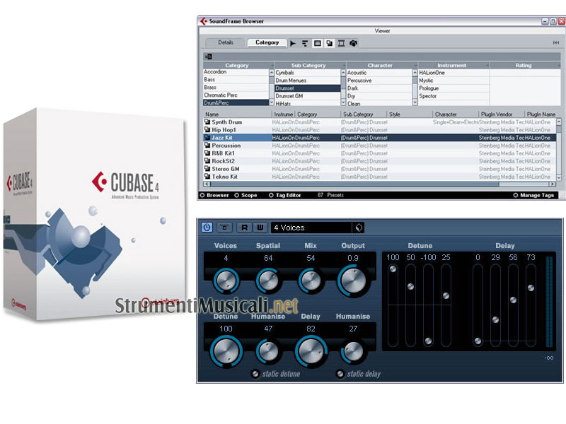 Cubase 4 offre nuove possibilità creative con una potenza ed una velocità senza precedenti per questa applicazione. Lo standard VST3 con un nuovo set di plugin integrato e quattro nuovissimi VSTi sono solo l'inizio: con SoundFrame™ avete a disposizione un sistema rivoluzionario per la gestione di tutti i file audio, delle patch e dei suoni, mentre con la nuova Control Room potete avere il controllo totale delle sorgenti esterne e dei sistemi per il monitoring. Cubase 4 include queste e molte altre nuove funzioni, che si vanno ad aggiungere a quelle già presenti ed utilizzate ogni giorno in migliaia di studi in tutto il mondo, con un'interfaccia utente ottimizzata, il sistema Audio Warp migliorato e le innovative Play Order Tracks per un sistema di produzione musicale ancora più flessibile ed avanzato.