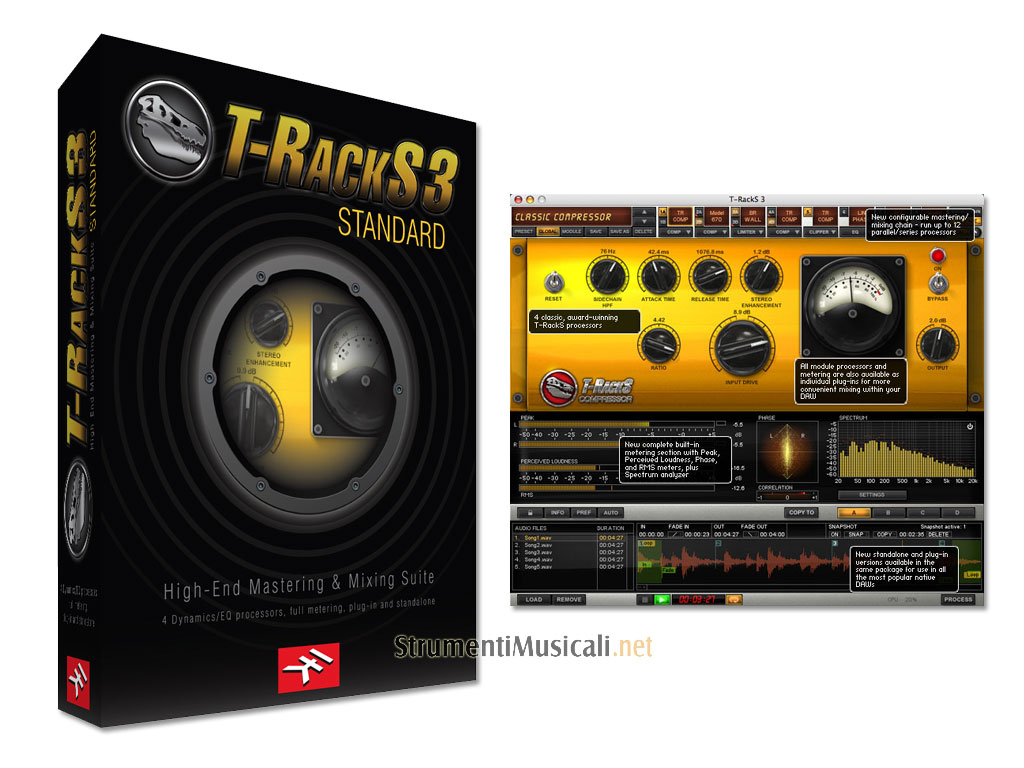 The new T-RackS 3 raises the bar again in high-end DAW mastering and mixing, with a suite of 4 Dynamics/EQ processors, full metering suite, an audio quality that is unmatched in software, and scores of new and unique features. All processors and metering module can be combined within the plug-in/standalone suite or are also available as individual plug-ins for more convenient mixing within your DAW, for a truly complete bundle of 7 superior sounding tools (5 individual plug-ins, plug-in suite, standalone suite).