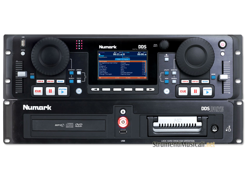 Numark introduce DDS80, il primo prodotto che include tutte le caratteristiche di un lettore CD professionale per DJ accoppiate al supporto dei file musicali, costituendo così lo strumento ideale per le esigenze dei professionisti del futuro. Il DDS80 è dotato di un Hard Disk integrato da 80GB (rimuovibile/sostituibile) e di 3 porte USB (due collocate nel pannello frontale) per il collegamento di memorie di massa (HDD, Pen Drive, iPod, MP3, etc.). DDS80 è dotato di uno schermo LCD ad alta definizione, a colori, che permette di visualizzare e gestire con semplicità la propria libreria musicale usufruendo del sistema "Crate" by Numark, il quale offre la possibilità di creare playlist da brani estratti dalle varie unità di memoria integrate e/o collegate allo strumento. DDS80 occupa in totale 5 unità rack da 19": 3 unità rack per il modulo di controllo, 2 unità rack per il modulo contenente il lettore CD e l'Hard Disk estraibile. Per quanto concerne le connessioni, il DDS80 fornisce due uscite di Linea stereo rispettivamente dedicate al player A e a quello B, 2 ingressi Fader Start per avviare la riproduzione delle tracce direttamente dal fader di un mixer predisposto. Le due unità rack sono alimentabili separatamente, quella di controllo mediante un alimentatore incluso, mentre quella CD/HD è collegabile direttamente alla presa di corrente mediante il cavo fornito in dotazione. Il drive CD/DVD permette di leggere CD-Audio e CD/DVD dati MP3. Potrai caricare i file audio dal tuo computer direttamente nell'Hard Disk integrato nel DDS80 via USB. Nella confezione troverai anche una tastiera USB Numark che ti semplificherà le operazioni di ricerca/caricamento delle tracce.