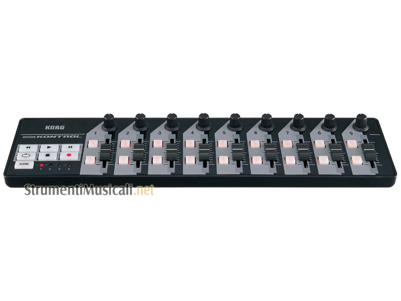 Il nanoKONTROL è dotato di una vasta gamma di controlli, per aiutarvi ad ottenere il massimo controllo del vostro software con la minima spesa e dimensioni ridottissime. nanoKONTROL offre nove cursori, nove manopole, 18 interruttori e una completa sezione di controlli del trasporto. Per ognuna delle quattro scene programmabili offerte dal nanoKONTROL, potete impostare i controlli in qualsiasi modo desideriate. Ciò significa che potete trasmettere un totale di 168 messaggi MIDI di CC (Control Change) differenti, così come note MIDI grazie agli interruttori. I sei tasti dei trasporti possono trasmettere ognuno sia messaggi MIDI CC o messaggi MMC per controllare funzioni come start, stop, loop, o la registrazione della vostra DAW software. Immaginate di acquisire il controllo completo del vostro software: trasporto, un'intera gamma di cursori, pan e mute, o un controllo dedicato quanto preciso dei molti parametri dei sintetizzatori e campionatori software o delle drum machine virtuali. Tutto questo è possibile grazie al nanoKONTROL. Per aumentare la flessibilità del nanoKONTROL, potete specificare un tempo di attacco e decadimento per i 18 tasti. Ciò vi consente di trasmettere del modo più lineare i messaggi di controllo a parametri come i livelli wet/dry di un effetto, al filtro di un synth, o come cursori del volume per una dissolvenza perfetta. Utilizzando il "KORG KONTROL Editor" (scaricabile gratuitamente dal sito web Korg) potete personalizzare il nanoKONTROL per adattarlo alle vostre necessità di controllo. Avete così accesso completo all'intera superficie di controllo per ognuna delle quattro scene disponibili. Compatibile con Xp, Vista, Mac