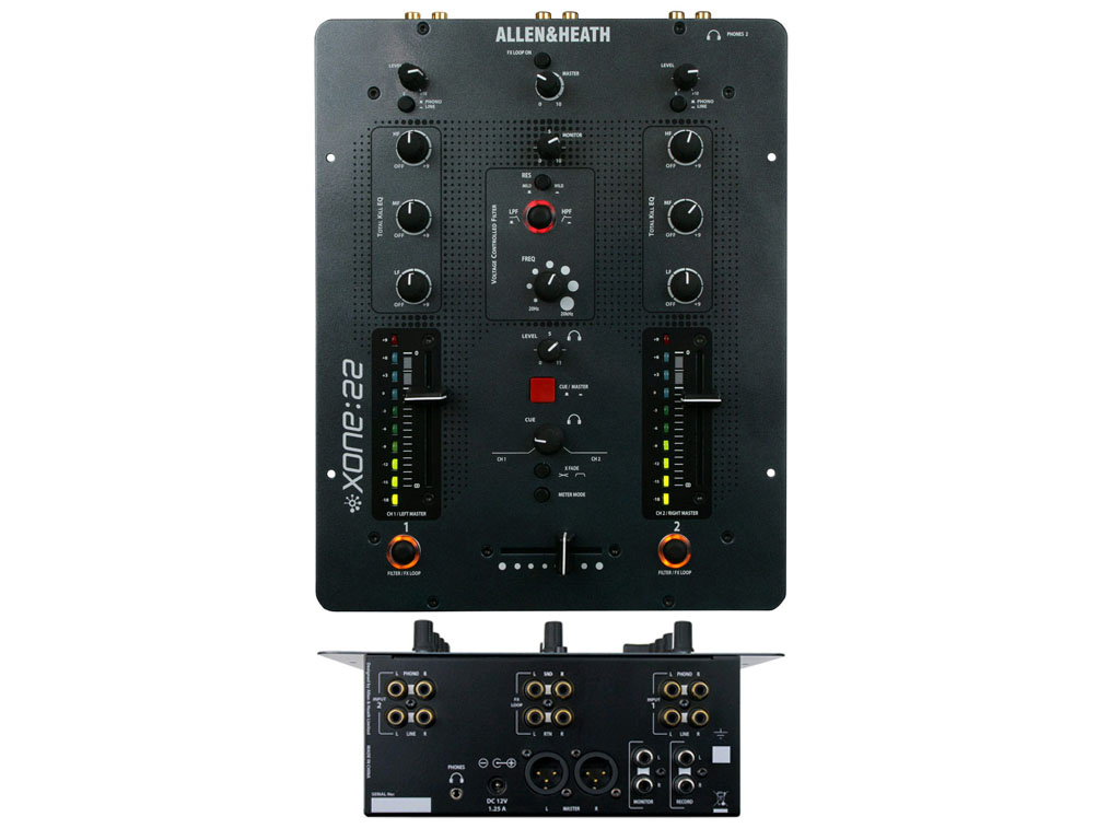Allen & Heath is proud to present the Xone:22 a 2-channel, analogue DJ mixer which offers the top quality audio and professional feature set usually only found in the booth of a top-rated club, all at an stunningly affordable price. They've raised the bar on entry-level mixer design with the Xone:22. It's equipped with their characteristic sound and build quality, and it's the first time a DJ mixer at this level has incorporated professional grade features, such as a full cut isolator/EQ, accurate metering, high quality faders and pro-standard audio headroom. They've incorporated a "lite" version of Xone's now legendary VCF filter system - a truly professional feature never offered at this level before. At the heart of the feature set is a lite version of the renowned analogue Voltage Control Filter (VCF) system offering Low-Pass and High-Pass filters, frequency sweep and 'mild to wild' resonance control. There is also a soft switched effects loop to bring in external effects, which are routed back in through the filter system. The new mixer has 2 stereo channels with dual phono/line inputs, and phonos can be configured to line if no RIAA sources are in use. There is a 3-band total kill EQ, crossfader curve control switch, and the maximum output level is a generous +25dBu. The main mix output and mic input are on professional standard balanced XLR's, and there is a dedicated record output. The Xone:22 is equipped with comprehensive monitoring facilities, including a booth output with its own volume control, a cue mix control, and 'cue-to-master' switch to preview the master output. There are also 10-segment LED meters with selectable bar or dot mode display for each channel. "We've raised the bar on entry level mixer design with the Xone:22. It's the first mixer at this price point to have a full cut isolator/EQ, accurate metering, quality faders and pro standard audio headroom. Incorporating a "lite" version of our now legendary Xone filter system is the icing on the cake," explains Xone designer, Andy Rigby-Jones. "We want to offer the bedroom DJ a quality performance tool and a taste of the professional club experience." To complete the club quality effect, the Xone:22 is finished with UV sensitive ink screen for improved low light legibility.