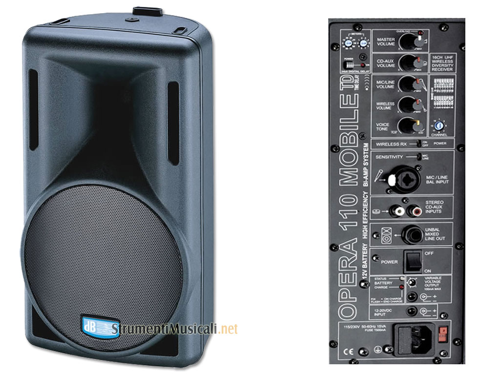 OPERA 110 MOBILE è un diffusore attivo compatto con mixer integrato, ricevitore UHF ed alimentazione selezionabile tra: rete a 230 V AC - ingresso DC bassa tensione - batteria 12 V incorporata. Massima flessibilità e facilità di impiego, per un'infinità di applicazioni. Lo speciale amplificatore con sleep-mode automatico consente fino a 12 ore di autonomia, a prescindere dal volume. Il ricevitore integrato è un UHF diversity della serie 900, con DCS e 16 frequenze commutabili. Garantisce elevati livelli di sicurezza, e può essere combinato con trasmettitori a mano o da cintura, con microfoni lavalier o ad archetto. Sono disponibili ingressi microfono e line stereo, regolabili separatamente. E' pure prevista una presa DC a tensione regolabile da 3 a 12 volt, per alimentare un lettore CD portatile o l'unità master/slave. Gli altoparlanti da 10" ed 1" dell'OPERA 110 si dimostrano ancora una volta ai massimi livelli per la riproduzione chiara e potente della voce, e la diffusione di musica a elevato volume con un' estensione impressionante. Il mobile è provvisto di flangia standard da 35 mm per installazione su piantana.