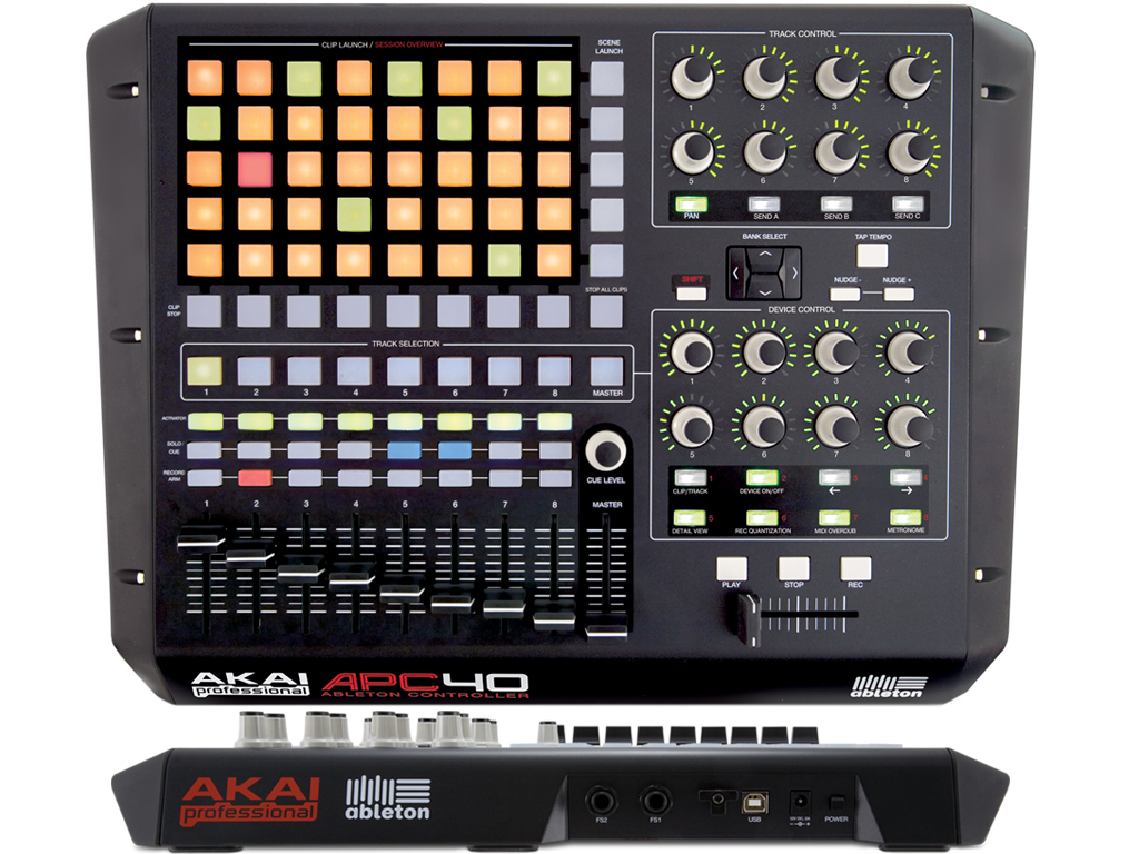 L'AKAI APC40 (Ableton Performance Controller) è il primo controller appositamente studiato per lavorare con Ableton Live, dal vivo e in studio di registrazione. Ableton e AKAI Professional hanno progettato l'APC40 per il software LIVE per evitare all'utente complesse configurazioni, di installare alcun driver, usufruendo della mappatura studiata appositamente dallo staff della Ableton. Per gli smanettoni L'APC40 è un MIDI controller a tutti gli effetti - potrai assegnare ogni parametro a tuo piacimento, sfruttando la funzione MIDI Learn di Ableton Live. E grazie all'integrazione di Ableton MAX per Live, potrai progettare applicazioni particolari per sfruttare le potenzialità dell'APC40. Ableton Live APC Edition, fornito con l'APC40, supporta massimo 8 tracce audio e MIDI, lavora alla stessa risoluzione della versione full (32-bit/192kHz), dispone di un solo ingresso e di due uscite stereo, include il sintetizzatore virtuale sample based Simpler, Impulse per la riproduzione e sintesi di suoni di batteria e percussioni, e tutti i 23 effetti audio e i 7 MIDI presenti nella versione completa di Ableton. 8 strumenti virtuali di Ableton Live apribili contemporaneamente in ciascun progetto e altrettanti gli effetti audio e MIDI, 3 mandate e i ritorni stereo. Per quanto riguarda gli strumenti e gli effetti virtuali VST/AU di terze parti apribili in un progetto, il limite è di 4 istanze per i primi, di uno per gli effetti. Sono supportati: il side-chain negli effetti, le automazioni multiple, gli inviluppi sulle clip, la compensazione automatica del ritardo dei plug-in, la mappatura istantanea dei controller MIDI, il MIDI clock, il supporto per computer multi-processore. Non sono supportati la funzione Freeze, il Rewire, i file REX, gli MP3, Ogg Vorbis, FLAC, quelli video, il Rewire, il Warping complesso, l'invio di messaggi MIDI ad apparecchiature esterne. 20 sono le scene supportate da ogni progetto.