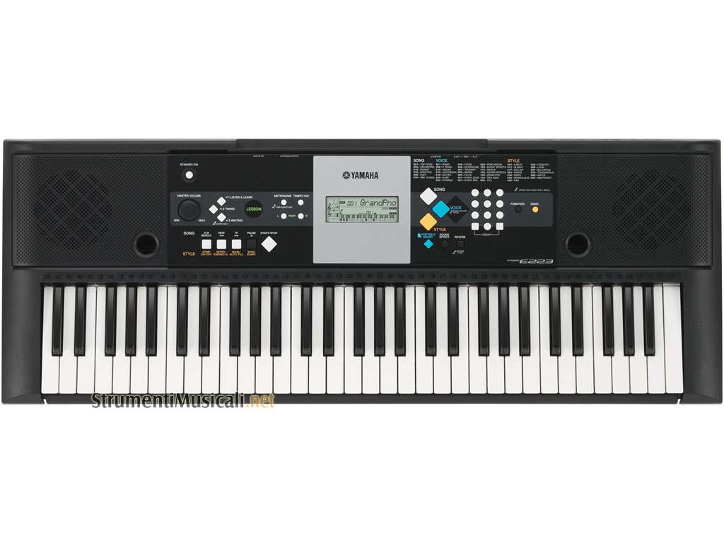 La PSR-E223 è dotata di 375 voci naturali, comprese le voci Stereo Grand Piano, 361 voci XGlite, 12 drum kit e un kit effetti sonori. La PSR-E223 dispone inoltre di 100 stili di accompagnamento e di 102 brani incorporati. Utilizzando il tasto Portable Grand è possibile richiamare istantaneamente il suono realistico di un pianoforte a coda. Lo strumento inoltre ha un ricco effetto Reverb che aggiunge l'ambientazione di una sala da concerto ad ogni performance. La funzione Yamaha Education Suite rende facile imparare a suonare, ed esercitarsi diventa divertente.