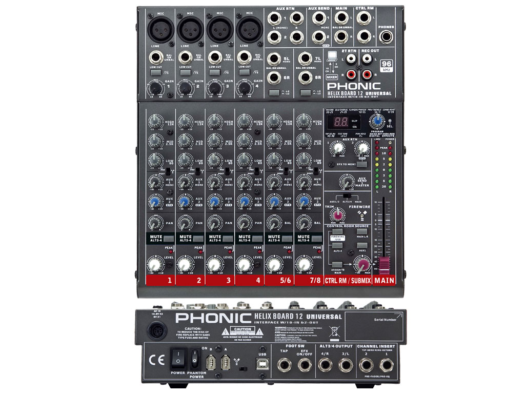 The Helix Board 12 Unversal is part of the new generation of Phonic's popular Helix Board mixers. It features 96 KHz USB 2.0 and FireWire interfaces that let you stream up to 10 independent channels of audio to the computer and return two channels to the mixer for monitoring - all with near-zero latency. Users are also able to utilize the main mix, ALT 3/4 and AUX 1 & AUX 2 signal for recording on the final two channels. Four extremely low noise Mic/Line preamps, each with 75 Hz low cut filters, inserts and phantom power, and two stereo Line channels offer a variety of input options. Pre/Post switches on each input channel allow users to adjust the outgoing USB 2.0 / FireWire signal between a pre-EQ, pre-fader, pre-low cut, to a post-EQ, post-fader signal. Each channel has a 3-band EQ and a mute button that sends the signal to the ALT 3-4 stereo bus, where several inputs can be grouped and controlled in tandem. Tracking individual inputs is easy with the stereo AUX cue. An onboard 32/40-bit digital multi-effect processor provides 100 popular programs, tap delay and test tones, and can be controlled through the use of a footswitch. Stereo RCA inputs and outputs make the addition of digital and analog playback and recording devices effortless. Additional features include two AUX sends, two stereo AUX returns, balanced stereo main outs, master AUX section with EFX to monitor, control room/phones source matrix and Steinberg's Cubase LE 4 digital audio workstation software.