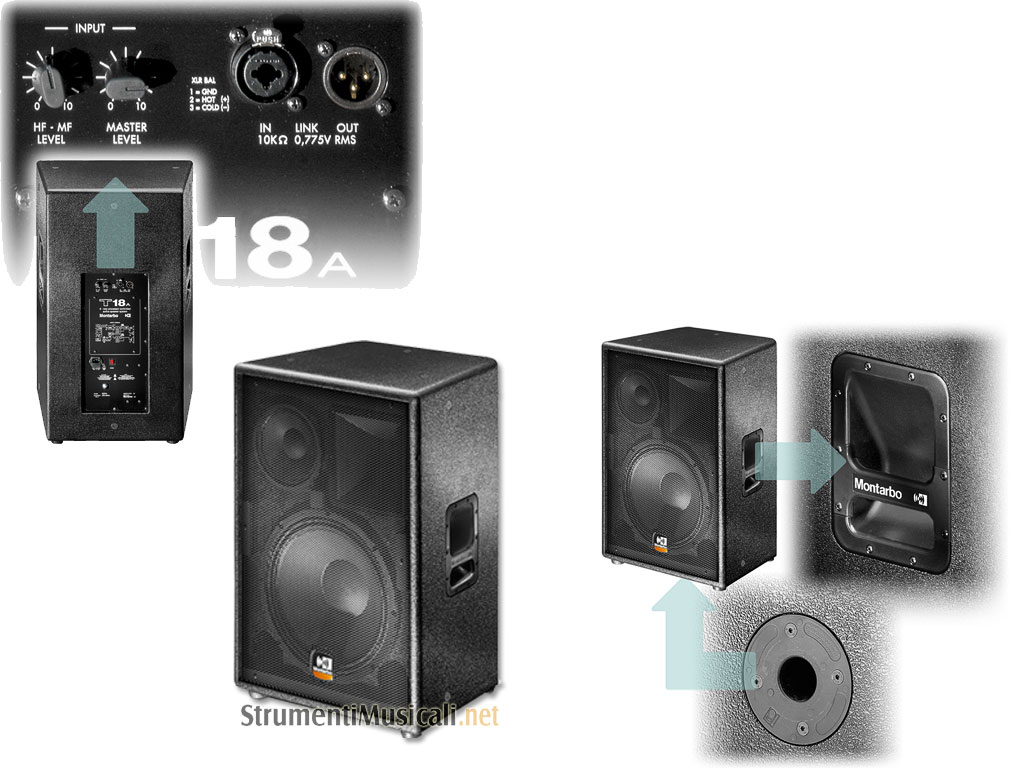 • Componenti (custom): Woofer da 18" con magnete al neodimio (bobina da 3") - Midrange da 8” - Driver a compressione da 1” (bobina da 2") - Tromba ruotabile a direttività costante (H 90° x V 70°);