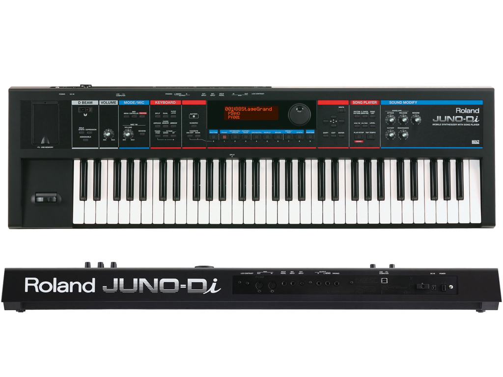La Roland Juno-Di è un sintetizzatore di alta qualità e un ottimo rapporto col prezzo. Esteticamente ha uno stile tipo anni'80 che può piacere a seconda dei gusti, con una disposizione dei pulsanti molto chiara e facilmente individuabile. Ha un'entrata Usb per la riproduzione di basi musicali su cui poterci suonare, un'entrata per il pedale di sustain, un'altra per il microfono ed ha la possibilità di essere alimentata a batteria, anche se ha una breve autonomia in tale modalità. La qualità sonora è veramente impressionante: è proprio una tastiera professionale adatta per concerti ed esibizioni Live. La quantità dei suoni è molto ampia, oltre 1000 suoni, in stile anche disco, la cui espressione può volutamente essere modificata tramite le apposite manopole del pannello "sound modify" sul lato estremo destro dell'interfaccia. Da notare l'assenza del leggio e degli altoparlanti integrati, per cui il suono si può ascoltare tramite cuffie o collegandovi uno o due amplificatori per tastiera (mono o stereo). E' veramente una bella tastiera in ottimo rapporto qualità/prezzo. Antonio Domenico F. da Riace Marina