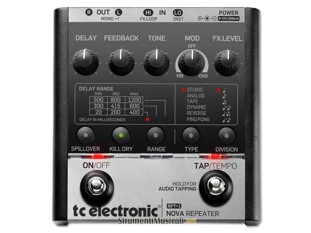 Nova Repeater is our new 'no-frills-with-a-sound-that-kills' delay pedal. It is the pedal for you if you are a demanding guitarist who wants instant, high quality and unique results, without any of the fuss! It features the same great sound quality that made our Nova Delay the first choice delay pedal for Paul Gilbert, Doug Aldrich, Nils Lofgren and Allen Hinds. However after listening to our guitar-playing community we have trimmed out any excess baggage while also including additional features over the Nova Delay, and designed it all behind a streamlined and very easy to use interface. In short Nova Repeater is the essential lean, mean, delay-machine! Nova Repeater is all about simplicity. There are no hidden features or complicated functions - you just get the world's best delays in a cheap and easy-to-use package. Yet it is also feature rich being the only pedal in its price range that has a dedicated tap tempo switch and our amazing audio tapping technology that lets you set the tempo with your playing. And with six types of TC-quality delays and an unsurpassed feature-set Nova Repeater is quite simply a bargain.