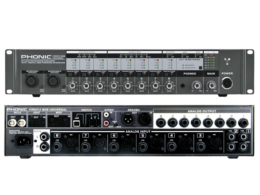 L'unità preamplificata Firefly 808 Universal montabile a rack di Phonic, con interfaccia USB e FireWire, è un interfaccia di registrazione facile da usare di alta qualità per compositori per registrare chitarre, tastiere, voce e altro sul computer. In primo piano ci sono 8 ingressi analogici (XLR e 1/4 ") e 8 uscite analogiche (1/4"), così come ingressi e uscite S/PDIF, AES/EBU, MIDI e ADAT tutte in streaming in tempo reale da e per computer tramite la connessione FireWire o USB in superbo audio 192kHz a 24 bit. Compatibile con le più popolari Digital Audio Workstation software, questa potente unità fornisce a musicisti e ingegneri del suono il dispositivo di registrazione sofisticato ma facile da usare di cui hanno bisogno.