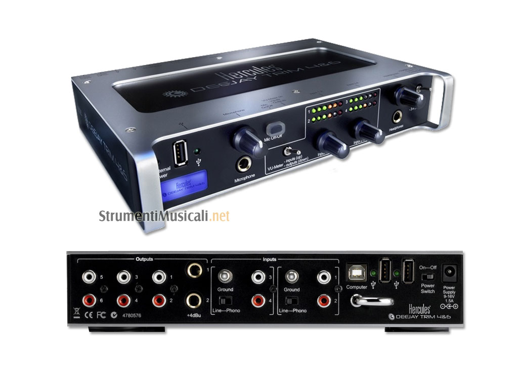 Hercules ha creato e personalizzato questa nuova soluzione interamente dedicata ai DJ. La Deejay Trim 4&6 ha in dotazione 4 ingressi/4 uscite che possono essere configurati anche come 2 ingressi/6 uscite, consentendo agli utenti di esportare i propri mix in una periferica di mixaggio esterna. L' interfaccia audio Hercules è dotata di 4 canali audio in uscita: due uscite da +4dBu con jack da 1/4" per periferiche PA e quattro uscite RCA da -10dBv per mixare banchi e amplificatori convenzionali. La modalità a 6 uscite consente agli utenti di trasferire ad un mixer esterno 2 tracce stereo separatamente, aggiungendo, allo stesso tempo, una terza traccia per campionamenti, loop ed effetti. Completano la ricca dotazione della scheda, un connettore per microfono con funzione talk-over, un connettore per cuffie con controllo del volume e un selettore del canale (canali 3 e 4 per monitoring e canali 1 e 2 per il mixaggio). Dotata di un hub USB high-speed da 3 porte, questa interfaccia Hercules può essere collegata ad un controller per DJ o una periferica di archiviazione esterna (ovvero una chiavetta USB o un hard disk). L'alimentatore (incluso) previene qualunque eventuale variazione di segnale generata dalle fluttuazioni della corrente elettrica attraverso il bus USB del computer.