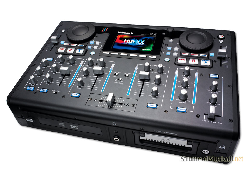 HDMIX è la soluzione completa per mixare ovunque. Dovrai solo collegarlo ad un impianto audio per mixare tutta la musica che vuoi. Costruito dalle mani esperte del team Numark, HDMIX ha tutte le funzioni di cui un DJ professionista ha bisogno durante le proprie performance. Non è un semplice mixer da DJ, ma una soluzione all-in-one: un lettore CD e di file audio dotato di un Hard Disk integrato da 80 GB e di porte USB per collegare iPod e altri device USB (HD, pen drive, ecc..) dai quali caricare le tracce MP3 da riprodurre, controllare e mixare. Costruito per le esigenze del "Mobile DJ" professionista, l'HDMIX è compatibile con i formati di file audio MP3, WAV e AAC (non protetti) e rende possibile la ricerca delle tracce presenti sull'HD interno per nome dell'artista, titolo, album, genere e velocità in BPM. Grazie alla funzione "Crate"', l'utente potrà crearsi proprie play-list anche durante l'esibizione. Le tracce "pescate" dall'HD vengono indirizzate ai due controller integrati dotati di wheel per il puntamento del Cue e lo scratch, di fader per il pitch control, loop, ecc. che permetteranno di trattare in modo professionale i file audio. L'HDMix incorpora un mixer professionale 3 canali, ognuno dotato di meter, gain ed eq 3 bande, ai quali l'utente potrà collegare anche gli strumenti esterni tradizionali dei DJ come lettori CD e giradischi. Nelle uscite audio del mixer troviamo la Master in formato bilanciato (XLR) e sbilanciato, e l'uscita Zone (RCA) per il collegamento delle casse spia. La presenza di un lettore CD/DVD nell'HDMIX permette di convertire i CD-Audio inseriti nel lettore in formato MP3, salvandoli direttamente sull'HD integrato. Dal drive CD-DVD è inoltre possibile leggere direttamente file da CD-Audio, CD-MP3 e DVD dati MP3. Tutte le operazioni sono estremamente semplificate grazie all'ampio display LCD a colori, ad alta risoluzione e alla tastiera USB Numark fornita in dotazione. L'HD integrato, installato in un cassettino estraibile con serratura di sicurezza per il bloccaggio (2 chiavi in dotazione), può essere tranquillamente sostituito dall'utente con HD di capienze differenti (fino a 1 TB). HDMIX è un sistema completo, funzionante in modo indipendente grazie all'HD interno, predisposto all'integrazione e all'installazione in locali, service, ecc. ecc.. In più, puoi acquistare il case opzionale per l'HDMIX, che oltre ad ospitare lo strumento per un comodo trasporto e posizionamento in qualsiasi situazione di utilizzo, ti fornisce una tastiera retro-illuminata posizionata su un comodo cassettino scorrevole.