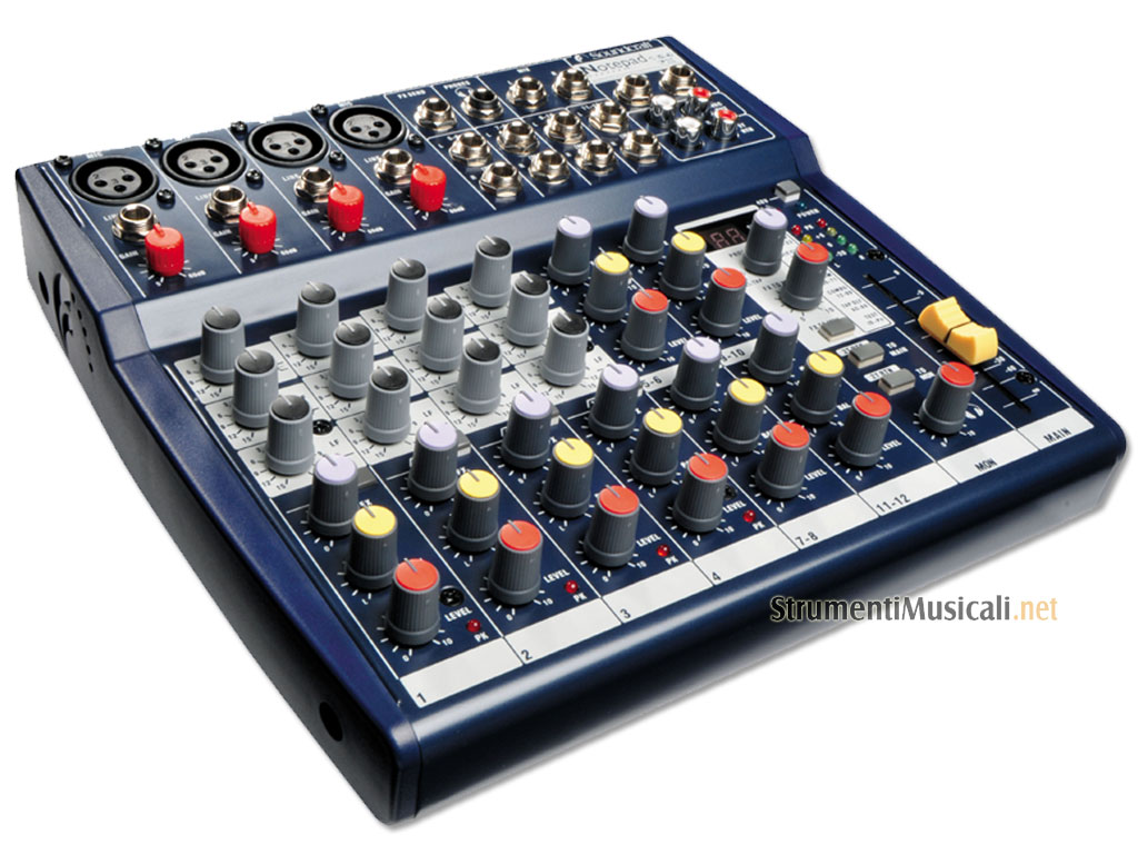 The new Notepad 102, 124 and 124 FX models boast Soundcraft audio performance with the acclaimed GB30 mic preamp and EQ technology in a highly-compact and solid chassis. Each 124 model has 4 mono mic/line inputs while the Notepad 102 has 2 mono mic/line inputs. All models boast 4 stereo line inputs, and suit a very wide range of applications where simple yet high-quality mixing is required, such as in home recording, small band/cabaret PA systems, AV presentation systems, small broadcast edit suites, educational environments and general contracting. The Notepad124FX also has an integral digital effects processor which has a feed from every input and over 100 effects, including a pink noise and test setting. The FX control can also be used to set delay tap tempo, a feature not found in many mixers in this class. On the Notepad 124, the FX send is replaced by a standard AUX send with a dedicated output. Both models provide a recording output of the mix on RCA/Phono connectors as well as a stereo input for CD playback etc. Other highly-desirable functions include a high-pass filter on the mono inputs, a 60mm fader for the mix output selectable sensitivity of +4dBu or 1-dBv on each stereo input (Notepad 124 models only) and multi-segment led metering on the mix output along with a headphone monitoring output.