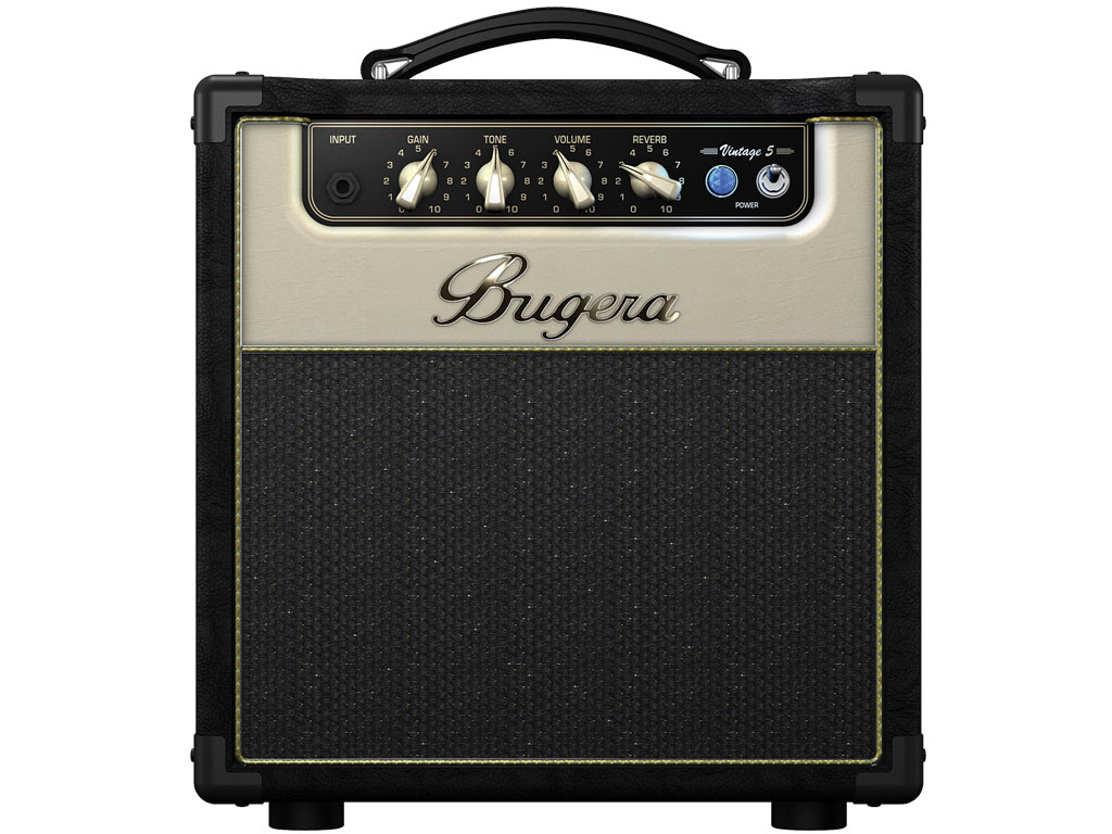 Dressed in classic two-tone vinyl, running on one power and one preamp valve and featuring bone-simple controls, the BUGERA V5 looks like a carefully constructed nostalgia trip. In fact, in many ways, it is! But plug into this beautiful little amp and you'll not only find a sound that's caked in real vintage raunch, but also modern features that take this sound to places it couldn't go—until now. Big Sound, Small Package: Rock music brings to mind amplifiers as big as skyscrapers, dishing out irreversible ear damage at ruthless volumes. But a studio secret among guitar greats is that little low-watt valve combos like the V5 can be maxed out for red-hot overdriven tone without blowing fuses or incurring any property damage. The V5 is a living, breathing homage to those half-pint screamers of the past, but with two very important improvements. See, this amp may be small, but 5 watts in Valvesville is still loud as hell when it's sitting in your bedroom. That's why the V5 features a switchable power attenuator that allows you to run 5, 1 or 0.1 Watts. An attenuator reduces the amplitude of a signal without changing its sound. That means you can still drive the valves into banshee-league fury, but without waking up the neighbors. Finding a headphone out jack on an all-valve guitar amp is incredibly rare because the integration requires loading the output transformer and filtering the signal for a loudspeaker simulation. But in true BUGERA fashion, we've gone the extra mile to allow you some late night practicing. Just plug in a pair of headphones to the 1/4" phones jack on the back panel, and you're ready to keep the V5's all-valve sound all to yourself. Then again, if it's more volume you need, the V5 has a 1/4" Speaker Out jack that allows you to connect an additional speaker with a minimum impedance of 4 Ohms. This dangerous dandy also features the same studio-caliber digital reverb found in its bigger BUGERA brothers. The spring reverb found in the V5's post-war predecessors sounds lovely, but is delicate and expensive to repair. The V5's modern update gives you an equally mesmerizing vintage reverb sound without the wallet-draining vintage reliability. Little Wonder: With the V5 in your home or studio, your tonal woes are over. It bears the true sound of an antique 5W valve amp, it's built to survive abuse, and its price tag is tons lighter than the ones you' ll find tied to its elders. Adopt a V5 today and get ready to pack 60 years of sonic inspiration into your recording or practice sessions.