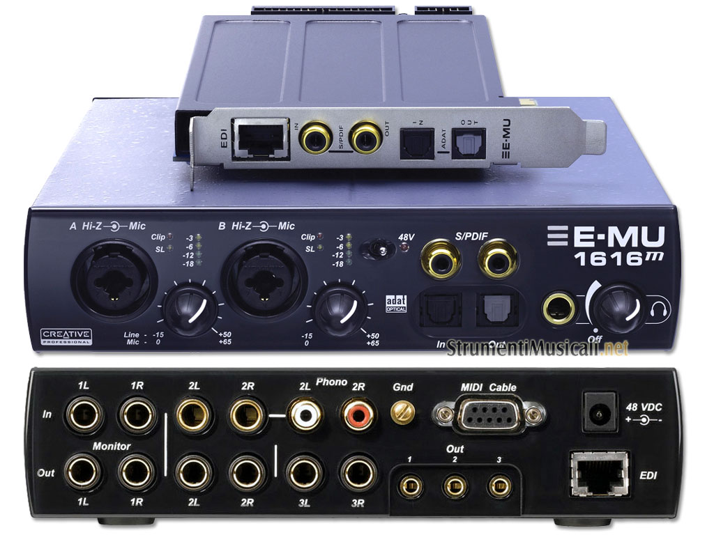 La E-MU 1616m PCIe offre tutto il necessario per produrre audio su un PC con un risultato professionale: convertitori 24-bit/192kHz, effetti e mixaggio con accelerazione hardware. La E-MU 1616M PCIe dispone di opzioni complete di sincronizzazione ed una compatibilità perfetta con il tuo software audio/sequencer preferito per PC. Il MicroDock M dispone di un totale di 16 ingressi e 16 uscite più 32 canali MIDI I/O, due preamplificatori E-MU XTC Mic / Line / HI-Z di Classe A con bassissimo rumore, alimentazione phantom 48V ed un morbido circuito di limitazione analogico per la protezione dal clip. Viene inoltre fornita con driver ASIO2 e WDM per Windows XP, XP x64, Windows Vista e Vista x64 e con il pacchetto software E-MU Production Tools che include: E-MU Proteus X LE, software di Steinberg, Ableton, IK Multimedia e molti altri ancora. Tutto il necessario per creare, registrare, editare e masterizzare musica.