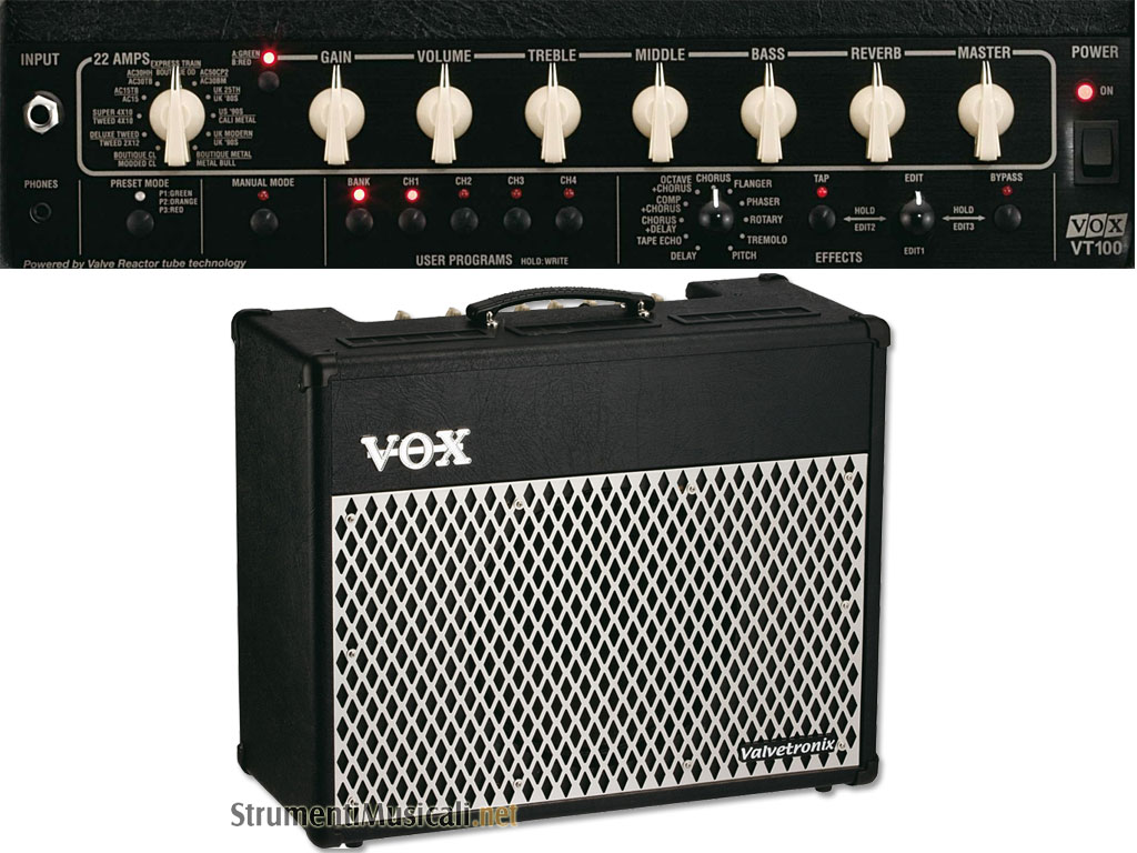 Il VOX VT-100 è dotato di una sofisticata tecnologia di modellazione in combinazione con il circuito di amplificazione di potenza VOX Valve Reactor che utilizza una valvola 12AX7. Il risultato è nella qualità del suono che travolge la concorrenza. Inoltre la serie VT, i combo più recenti della serie Valvetronix, sono dotati di simulazione dei suoni di chitarristi famosi.