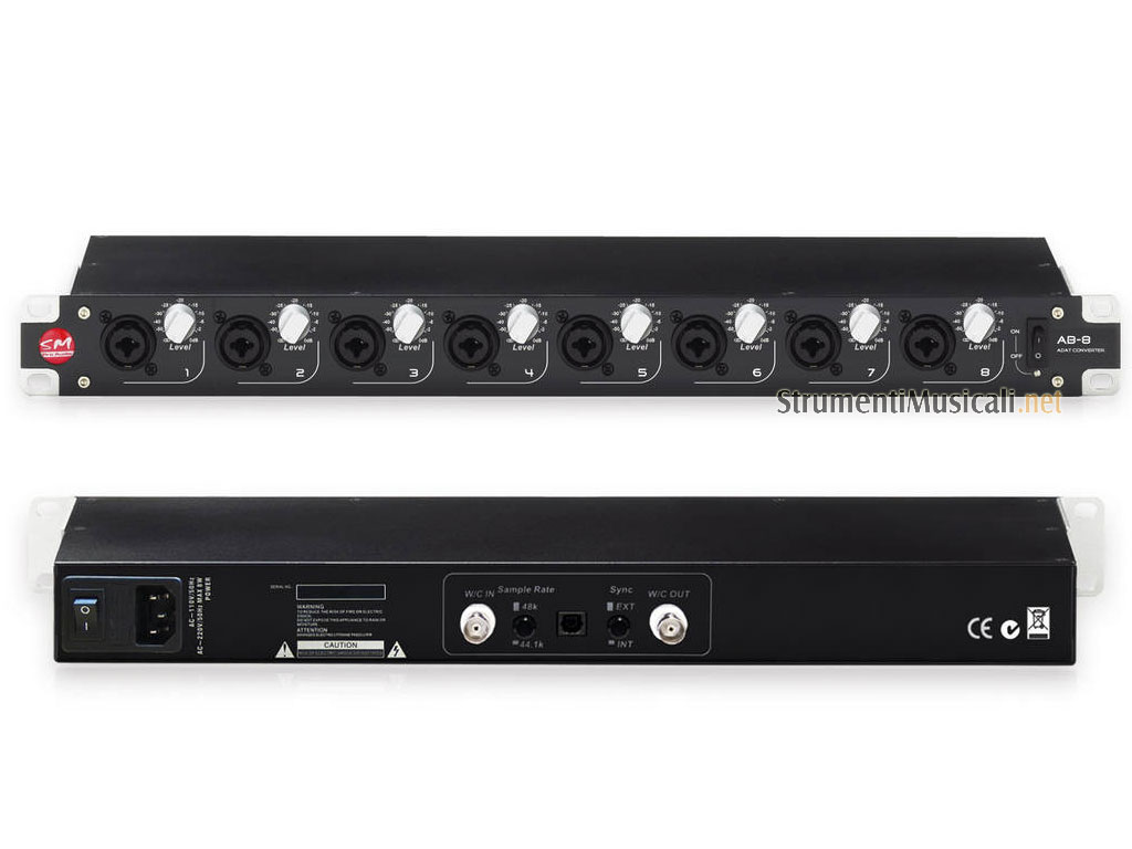 Convertitore analogico-digitale dotato di 8 ingressi analogici combo bilanciati/sbilanciati, equipaggiati con trasformatore di isolamento e attenuatore di livello passivo, uscita digitale ADAT Lightpipe ad 8 canali a 24 bit / 44.1 e 48 kHz, word clock In e Out, alimentatore interno 110-220V, formato rack 1 unità.