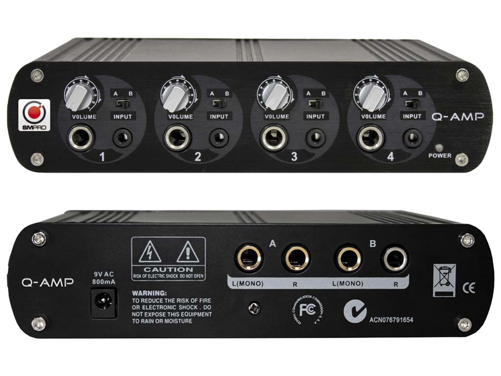 • 4 amplificatori stereo, ognuno con regolazione del volume, selettore di sorgente (ingresso A-B) e uscita cuffia con jack 1/4" e jack 1/8"