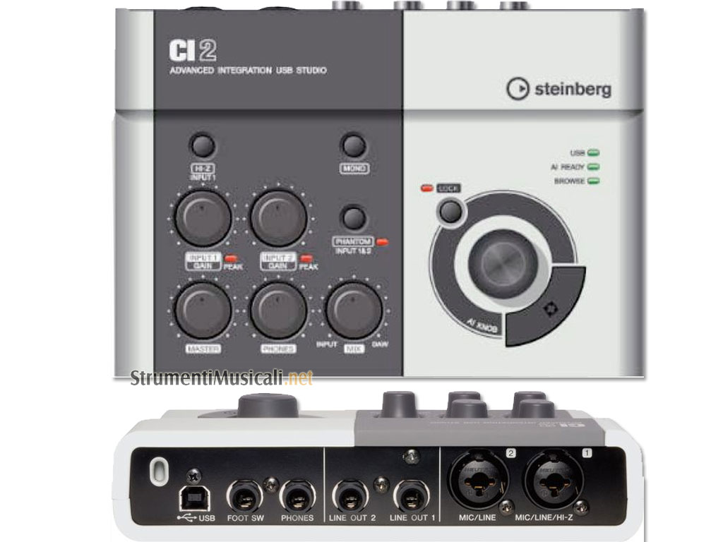 La CI2 Advanced Integration USB Studio e' un sistema sapientemente integrato e rappresenta tutto cio' di cui hai bisogno per la registrazione e produzione di progetti in casa, in sala prove, oppure in viaggio con il tuo laptop. La CI2 alimentata USB grazie alla particolare tecnologia Advanced Integration l'interfaccia CI2 si integra perfettamente con Cubase AI5 (incluso nella confezione), offrendoti vantaggi altrimenti irraggiungibili per la produzione e registrazione della tua musica. Puoi semplicemente selezionare un template dal Project Assistant, gestire start, stop, rewind della tua registrazione con la pressione di un tasto (o del footswitch opzionale) e rifinire il tuo brano con le funzioni di editing e mixaggio in Cubase AI5. Tecnicamente CI2 si presenta come un'interfaccia a due canali XLR combo, dotata di due sofisticati preamps microfonici e phantom power, un HI-Z per l'input diretto della chitarra ed un connettore per il pedale per l'Interactive Recording. La sezione controller vanta la nostra innovativa manopola AI Knob, che garantisce un controllo intuitivo e comodo di Cubase.