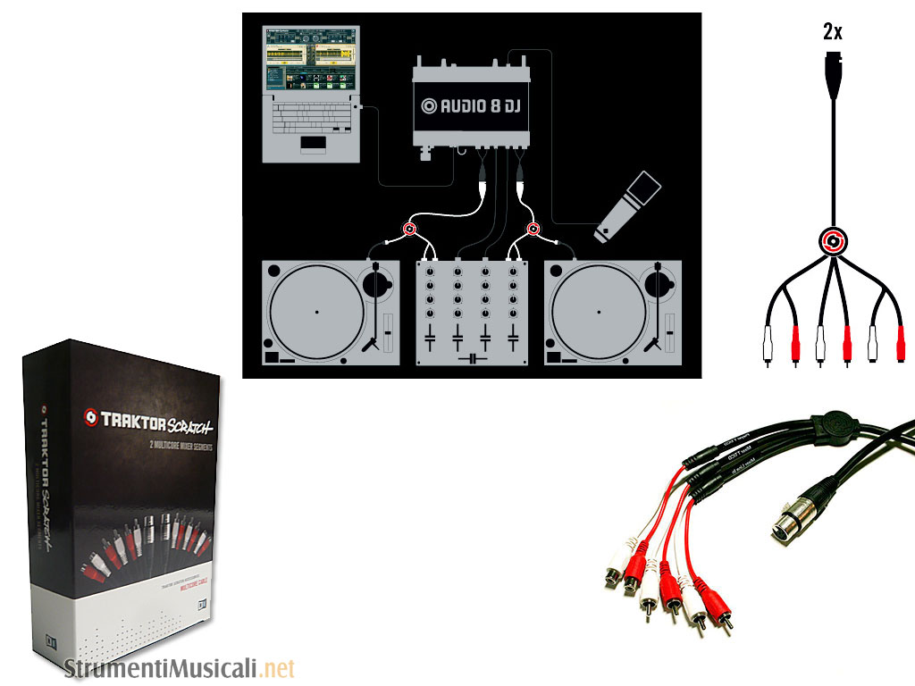 Native Instruments' Multicore Cable creates a simple and efficient method of connecting the components of any digital vinyl system (DVS), like Traktor Scratch, Serato Scratch Live, Torq, Virtual Vinyl or Final Scratch. By unifying all the cabling from turntables, CD players, mixer and audio interface into two locking XLR connections, it allows the DJ to easily transport his/her laptop and audio interface to any other traditional DJ setup (turntables/CDJs + mixer).
