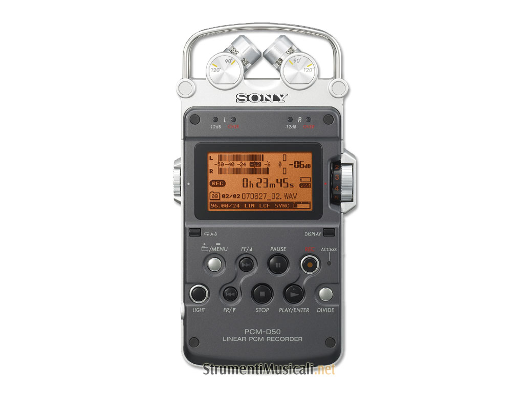 Ultimo nato nel line-up di Sony di registratori audio portatili, il registratore PCM-D50 riprende molte delle caratteristiche dall¿apprezzato modello PCM-D1, tra cui la struttura resistente e il design elegante. È la scelta ideale per eventi musicali live, acquisizioni di suoni naturali e registrazioni sul campo. Il PCM-D50 è un registratore a 96 kHz/24 bit dotato di microfoni stereo a due posizioni (X-Y o Wide), 4 GB di flash memory interna e uno slot Memory Stick Pro-HG Duo¿ che ne incrementa la capacità di archiviazione. Con quattro batterie alcaline AA, consente 14 ore di registrazione a 44,1 kHz/16 bit. Caratteristiche uniche quali il microfono stereo a due posizioni, il buffer pre-registrazione che registra cinque secondi di audio prima di premere il pulsante Record, il controllo digitale del pitch e la funzione di ripetizione/segmento A/B offrono straordinarie possibilità portatili per autori di canzoni, musicisti e giornalisti.