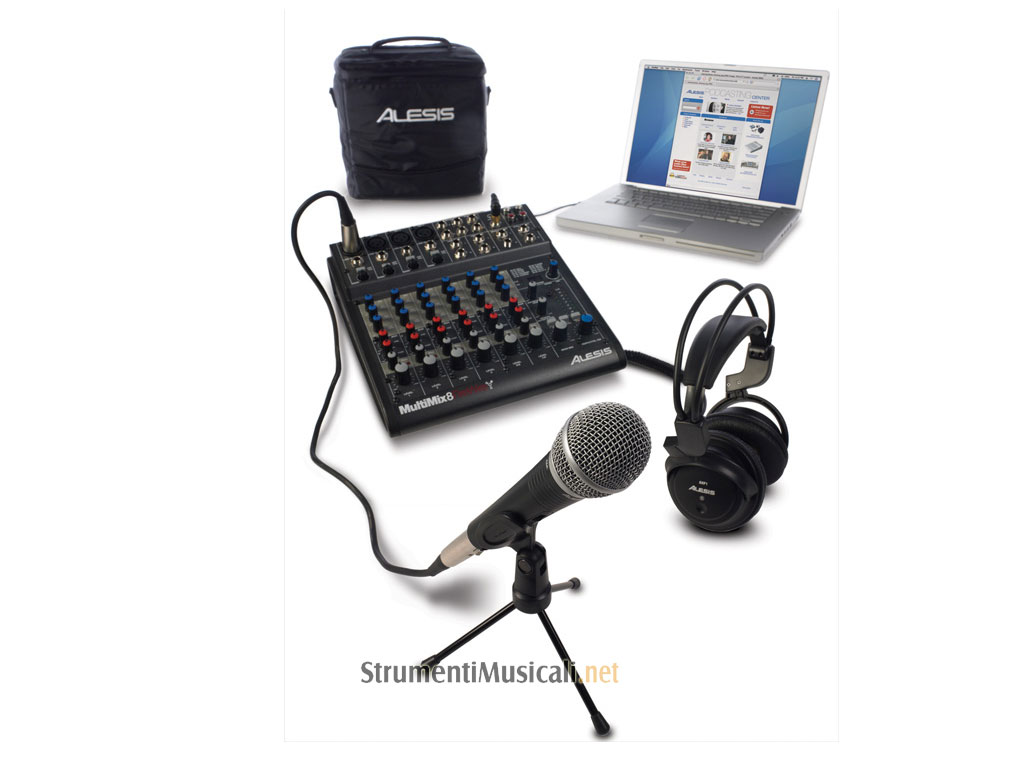 • Multimix 8 FireWire, microfono dinamico con stand da tavolo, cuffie, software per il podcasting, Cubase LE, borsa morbida serigrafata per trasporto del kit.