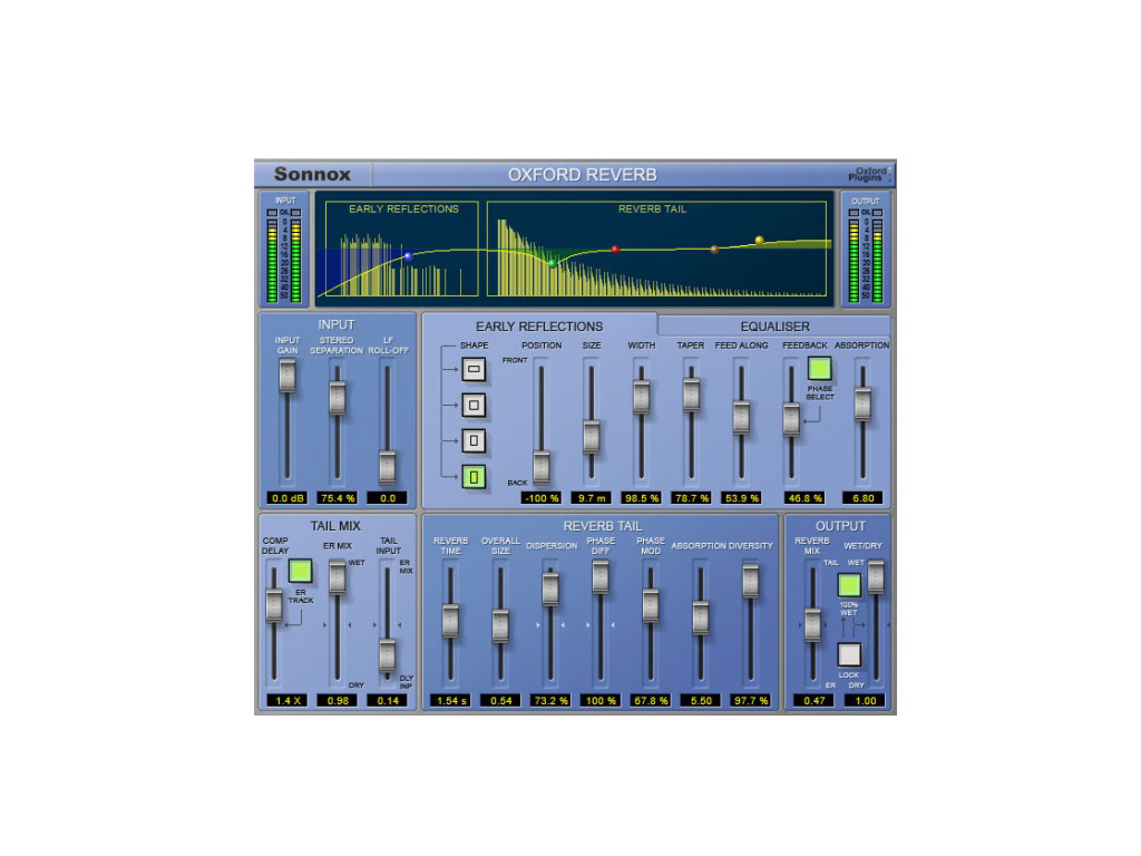 Il plug-in Oxford Reverb è un reverbero stereo molto flessibile, progettato per fornire all'utente il massimo della tecnologia e della qualità sonora, unita ad una serie di caratterisitche creative molto interessanti. Oltre a fornire una impressionante libreria di presets pronti all'uso, l'utente ha il pieno controllo di tutti i parametri, tra cui un'ampia sezione per la regolazione delle prime riflessioni, ed un EQ integrato a 5 bande. Il Riverbero Sonnox Oxford permette, con grande facilità, di creare liberamente spazi virtuali, a seconda delle necessità artistiche, che vanno dalle riflessioni dry un piccolo ambiente, alle simulazioni di rooms e halls, agli effetti sonori ed agli ambienti di grandi dimensioni.