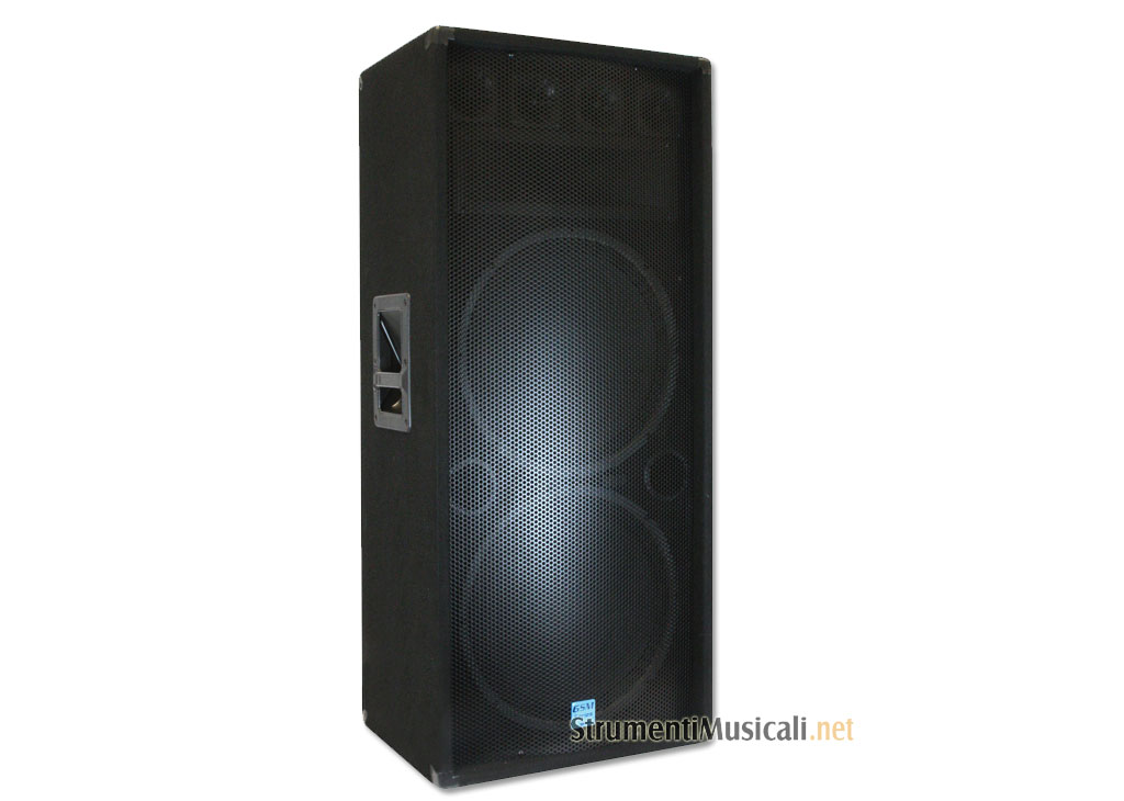 Diffusore a 3 vie con 2 woofer da 15'' tromba da 15''x5'' e 4 tweeter piezo da 3''. Potenza 300W RMS su 4 Ohm, risposta in frequenza 35- 20kHz. Cabinet rivestito in moquette nera