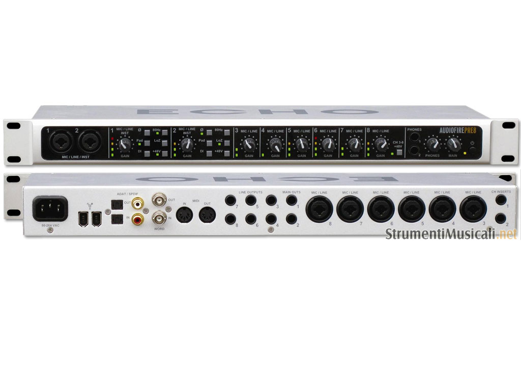 La nuova scheda audio Echo Audiofire Pre8 prevede ben 16 In e 16 Out con 8 pre microfonici. La AudioFire Pre8 si basa sullo stesso hardware di altissimo livello della linea Echo AudioFire, ma con l'importante aggiunta di 8 ingressi universali Auto-Sensing che implementano la tecnologia proprietaria Echo Brilliant per la preamplificazione. Con la AudioFire Pre8 è possibile effettuare registrazioni a 24-bit 96 kHz con monitoring a bassa latenza su qualsiasi sistema desktop o portatile con porta FireWire basato su Windows XP/Vista/7 o Mac OS X.