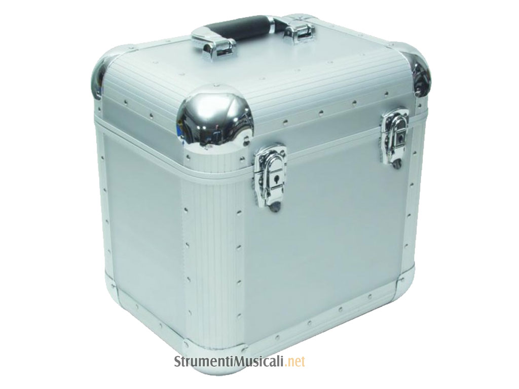 Portadischi in alluminio con angoli arrotondati e top rimovibile, contiene circa 80 dischi. Colore silver.
