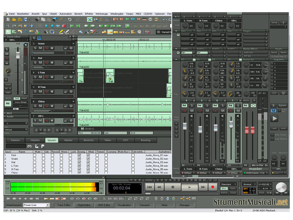 • 128 tracce (999 tracce in Samplitude 11 Pro), 64 Bus e infiniti strumenti VST per progetto. All'interno di ciascuna traccia è possibile elaborare ogni parte, detta oggetto, con tutti gli strumenti ed effetti, creando in questo modo infinite possibilità di variazione