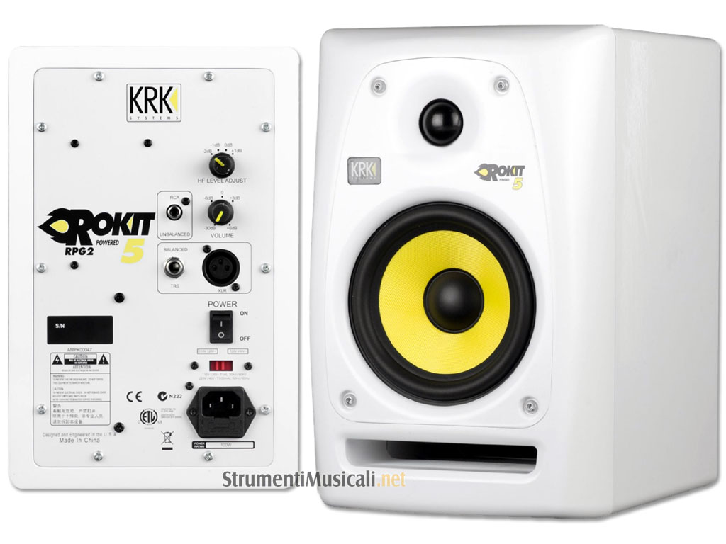 La serie di monitor KRK RP5 G2 SE si distingue per la finitura di colore completamente bianco anche per conferma del suono "pulito" caratteristico delle versioni "gemelle" RP5 e 10S della casa madre KRK. Naturalmente anche in questo caso la sigla SE contraddistingue una edizione speciale, disponibile quindi in non molti esemplari. La nuova "KRK Rokit G2 Series" migliora ulteriormente la linea di monitor da studio più accessibile della KRK che, ora più che mai, non ha davvero rivali per rapporto qualità-prezzo. Tutte le caratteristiche che hanno reso celebre la linea Rokit (tweeter a cupola in seta, woofer in tessuto composito di aramide e vetro e bass port frontale) sono sempre presenti, ma la linea Rokit G2 prevede ora un voicing perfezionato e un nuovo design ispirato alla linea top VXT e alle E8B che consente di ridurre fenomeni di diffrazione, garantendo una migliore accuratezza in fase di ascolto
