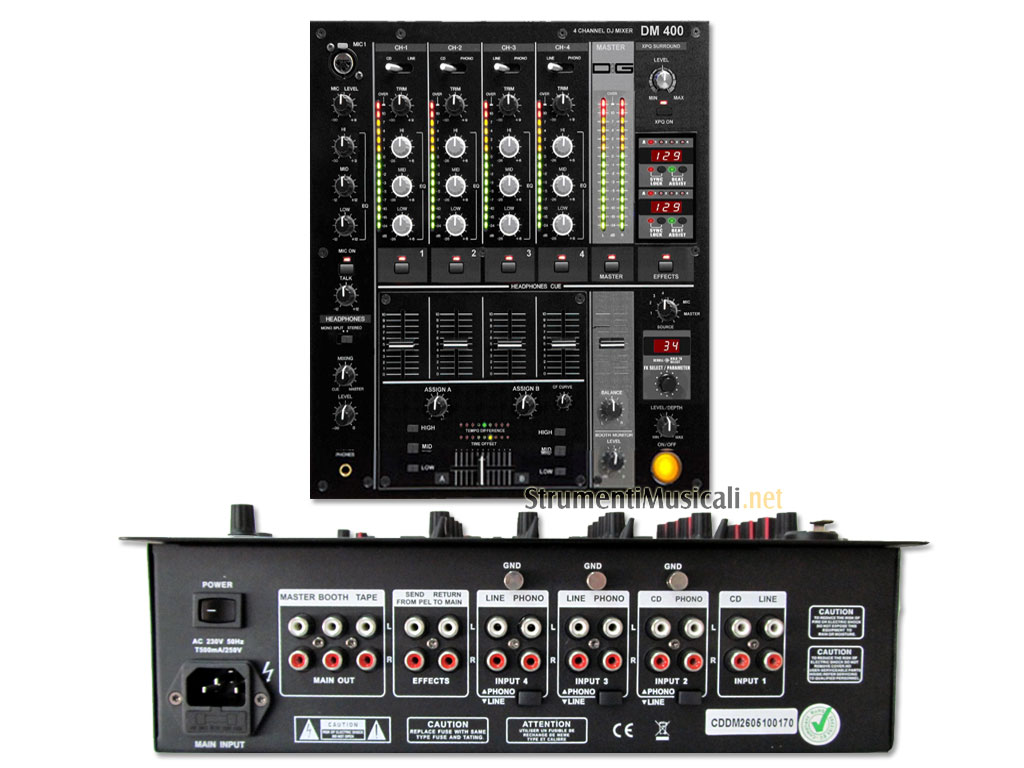 DM400 è una soluzione molto interessante per i mobile DJ, ma anche per Clubs, Pubs, e tutti i locali dove si ascolta musica con un set di qualità. Oltre alla sua qualità Pro, questo mixer ha un'elevata versatilità come unità effetti incorporata specifica per DJ, circuito TalkOver per il microfono, display BPM del tempo con funzioni "sync lock" e "beat assist". Il suono potente è garantito dall'elevatissima dinamica degli stadi (+21 dB per il master)