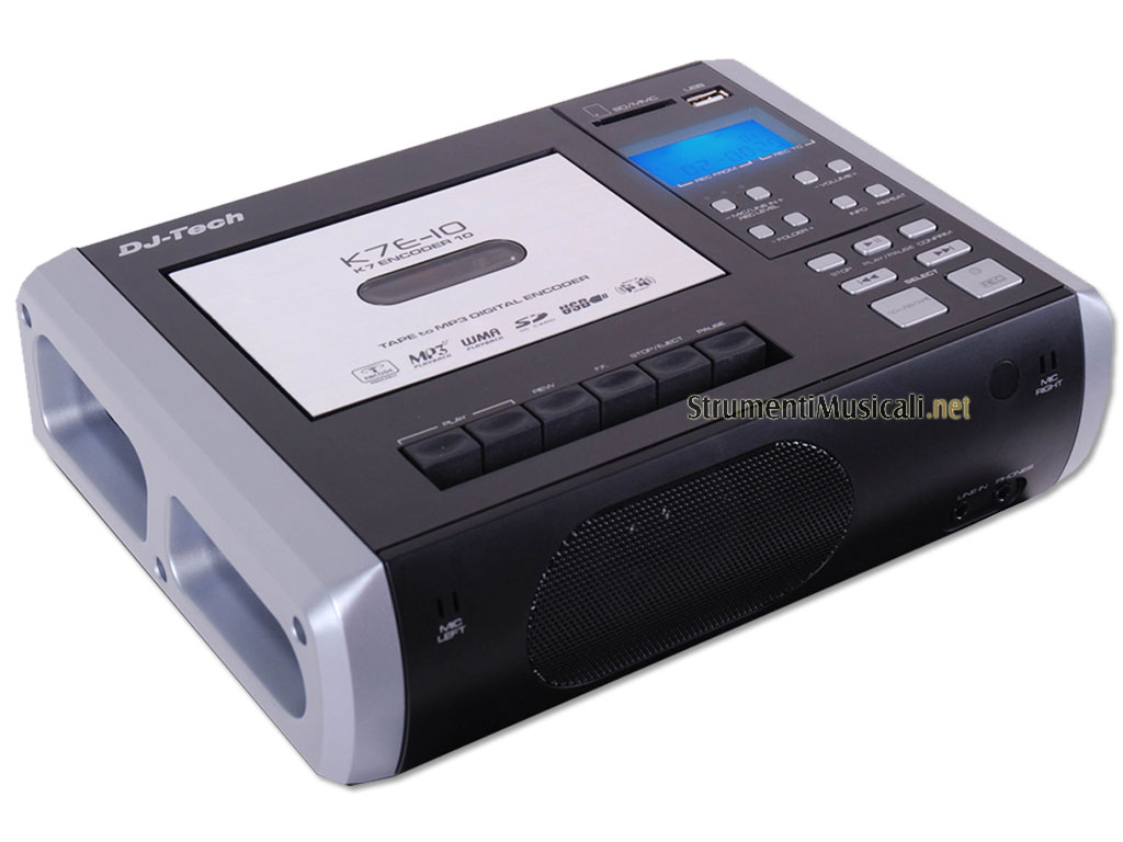 K7 encoder 10 permette di trasformare le vostre raccolte musicali o demo da cassetta in MP3 senza aver bisogno del computer. Grazie all' amplificatore e agli altoparlanti incorporati ascoltate e selezionate i brani da convertire, è possibile selezionare la porta USB o l' SD card per memorizzarli. Inoltre, il microfono incorporato e la LINE IN, permettono di registrare la voce o le vostre perfomances dal vivo.