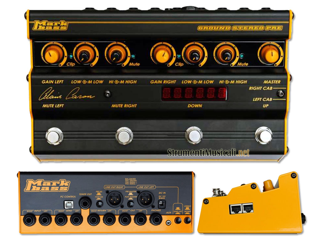 Stereo solid state preamp con controllo customizzazione BAS 121, 1.15kg. Il Ground Stereo Pre è un innovativo preamp stereo con controlli semplici ed efficaci (chiaramente è utilizzabile anche in mono). Il numero di connessioni in/out consente di soddisfare ogni esigenza e solo grazie all'altissimo livello di ingegnerizzazione proprio di Markbass è stato possibile concentrale tutte in un pedale, che possiamo defi nire senza dubbio state-of-the-art! Alain Caron usa quasi sempre effetti stereo, quindi le sue esigenze erano quelle di un preamp stereo e ovviamente di due cabinets. Il Ground Stereo Pre ha quattro bande di EQ per ogni canale e consente il collegamento al PC e ai due cabinets BAS 121 per poter scegliere fra i vari presets di EQ dei cabinets signature