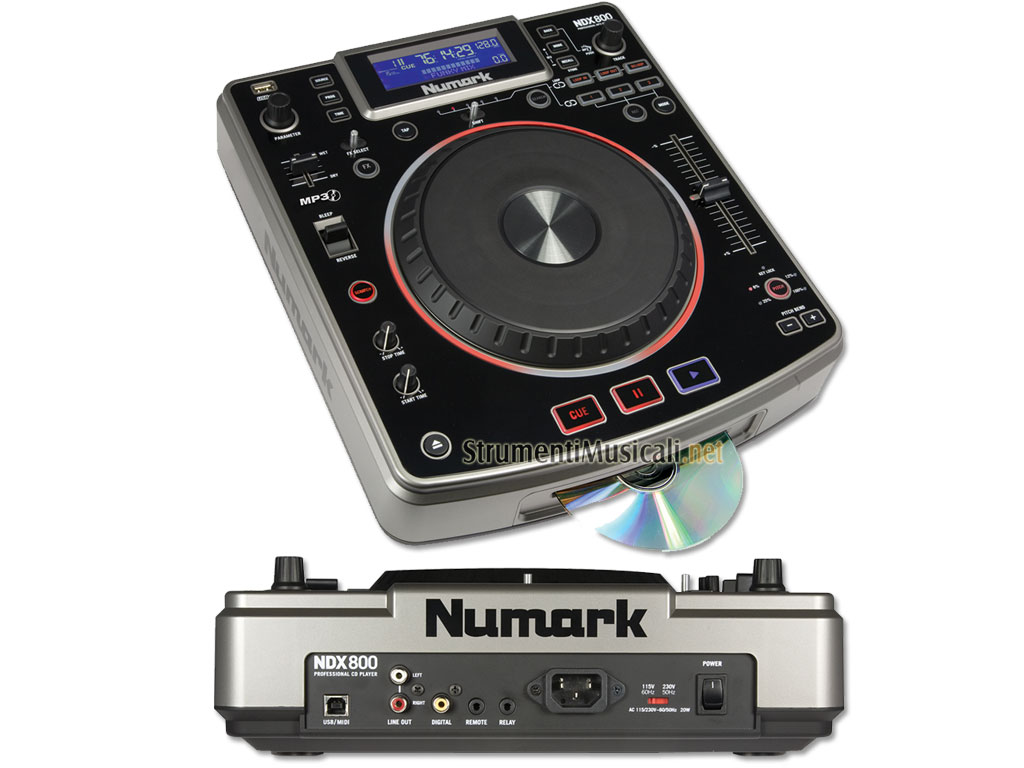 Il Numark NDX800 è un lettore multifunzione professionale dedicato ai DJ che sfruttano le tecnologie e i formati attualmente più diffusi nel mondo del DJing. L'NDX800 è un lettore CD Audio/MP3 con caricamento a slot (fessura), un lettore di memorie massa USB (pen drive e HD) e un MIDI Controller. Operando sulle tracce audio dei CD, o sui file MP3 caricati su memorie di massa USB (pen drive o HD) o CD, l'NDX800 fornisce le seguenti funzioni: pitch control (+/-6, 12, 25 e 100%), pitch bending da wheel e/o da tasti dedicati, key lock (master tempo), loop, campionamento, hot cue e i seguenti effetti sincronizzabili ai BPM: chop, eco, filtro, flanger, pan e faser. Gli effetti sono controllabili mediante un potenziometro rotativo per la modifica del parametro, un fader Wet/Dry e un selettore a leva. L'ampia wheel da 7" consentirà di skratchare i brani caricati nell'NDX800 e di simulare il controllo stile vinile. L'ampio display retroilluminato ci fornirà un feedback visivo delle varie funzioni in uso, gli ID tag e le informazioni temporali delle tracce in riproduzione, la navigazione nelle cartelle, ecc.. I BPM saranno calcolati automaticamente e mostrati sul display, oppure sono inseribili manualmente mediante la funzione/tasto TAP. NDX800 funziona inoltre come controller MIDI su porta USB, consentendoti quindi di controllare tutti i software di mixaggio MIDI compatibili attraverso un'interfaccia fisica classica e professionale per DJ.