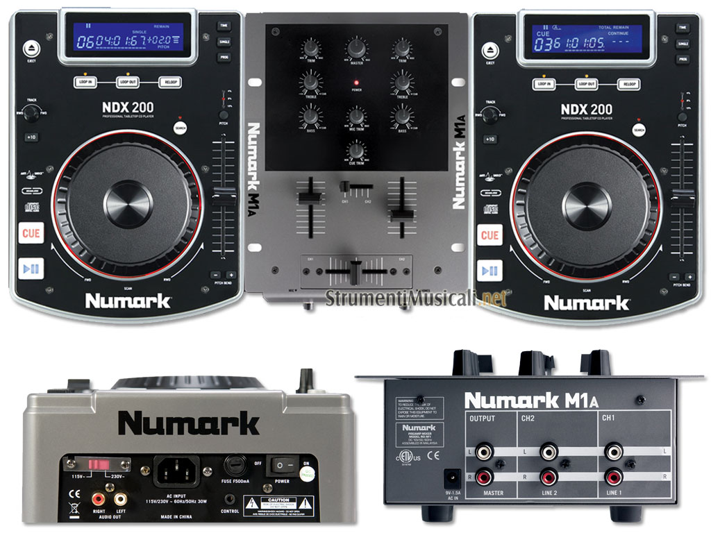 CD DJ IN A BOX è una console completa per DJ che include due lettori CD, cuffie e un mixer due canali. Due lettori CD robusti dotati di una larga wheel per ottimizzare le performance e del buffer Numark's Anti-Shock™ che previene skip e salti delle tracce lette quando il lettore è sottoposto a vibrazioni. I lettori CD audio in dotazione sono gli NDX200 con wheel per la ricerca e impostazione del punto di CUE, pitch bending (disponibile anche sui tasti +/- dedicati), fader del pitch control impostabile nei range +/-4, 8 e 16% e un loop (tasti loop in, loop out e reloop). Il mixer M1A offre due canali line con eq due bande e gain, ingresso microfonico su un canale dedicato, crossfader e preascolto in cuffia. L'uscita è in formato stereo RCA con controllo di volume dedicato.