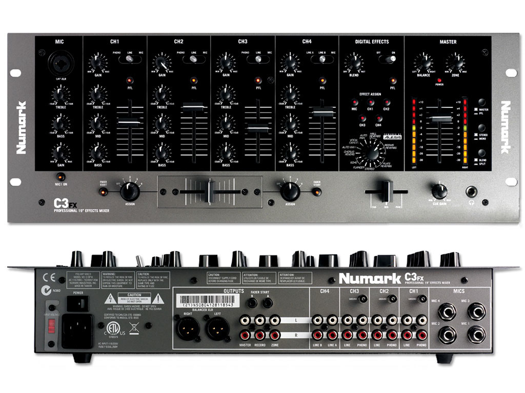 C3FX è un mixer a rack con cinque ingressi microfonici ed effetti digitali per DJ. Il DSP integrato di elaborazione digitale degli effetti compila perfettamente il suono in qualsiasi situazione o ambiente. Configurato con quattro canali più il mic DJ Control, il C3FX comprende cinque ingressi microfono, cinque ingressi line e tre phono. Ogni canale è dotato di EQ a tre bande. Le uscite Bilanciata, Master, Record, e Zone completano la gamma delle connessioni. L'elaborazione di effetti digitali avanzata di Alesis comprende due tipi di Hall Reverb, tre Room e tre Plate-Reverb diversi, Flanger, due tipi di Echo, Chorus-Reverb, Auto Wah, Vocal Cancel, e Auto Pan. L'innovativa funzione Vocal Cancel consente di rimuovere la voce solista su quasi qualunque canzone e di cantare insieme, rendendo il C3FX ideale come mixer karaoke. Split e blend-cueing sono opzioni disponibili, così come il controllo del gain PFL, start fader e pan sul ​​fader master. Il crossfader è assegnabile e sostituibile per lunga durata.