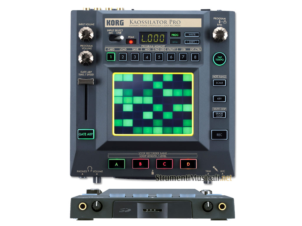 Raccogliendo tutte le segnalazioni e i suggerimenti dei numerosi musicisti, DJ e Live Performer che usano il Kaossilator, nasce la nuova versione Kaossilator PRO, che offre una versatilità e un interfacciabilità con altri strumenti (software e hardware) senza precedenti, unite ad una ricca libreria sonora in dotazione. 200 sono i programmi disponibili nel KAOSSILATOR PRO: 130 suoni per coprire i generi musicali Electro Pop, Electro House, Hip Hop, House, Techno, Breaks, D'n'B, etc, più altri 70 derivati dal Kaossilator. Per quanto concerne i suoni di batteria, percussioni e groove, nel Kaossilator PRO è stata aggiunta una wavetable PCM. Grazie alle 8 memorie, ognuna richiamabile da un tasto dedicato, potrai salvare e richiamare al volo durante le tue performance gli 8 Program preferiti. KAOSSILATOR PRO vi permette di suonare i suoni in esso contenuti mediante il Touch Pad, il quale emula una tastiera ed è programmabile per coprire tutto il range di note, oppure un'unica ottava: offrendo così una maggior precisione durante le performance live o in studio.