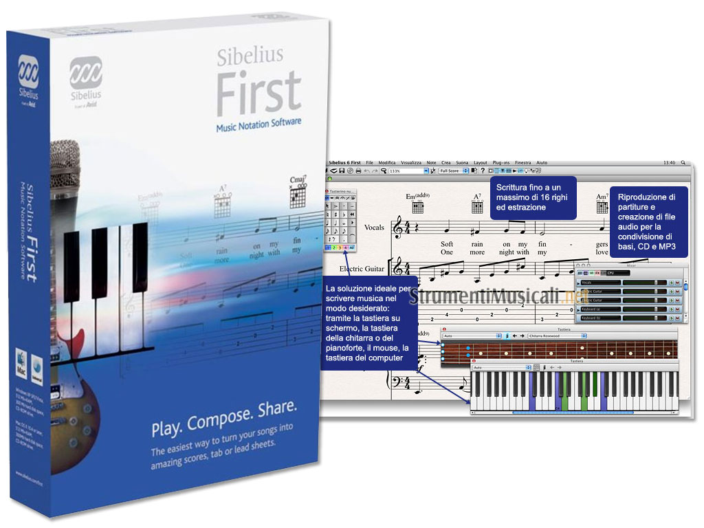 Avid presenta Sibelius First, la nuova versione entry level di Sibelius, il metodo più rapido, semplice e intuitivo per creare partiture dall'aspetto professionale pronte per la stampa, la condivisione, l'esecuzione e la distribuzione online basato sulla nota tecnologia di notazione musicale di Sibelius 6. La nuova versione 'First', interamente in italiano, consente di creare partiture con un massimo di 16 righi e implementa alcune delle straordinarie funzioni di Sibelius 6 come il Layout magnetico per la risoluzione automatica delle collisioni, la possibilità di utilizzare strumenti ed effetti virtuali VST e Audio Unit, la regolazione automatica delle dimensioni di pagine e righi in base alla musica, la sincronizzazione ReWire con DAW e sequencer, il riconoscimento automatico di simboli di accordo e un'ampia gamma di dispositivi MIDI supportati.